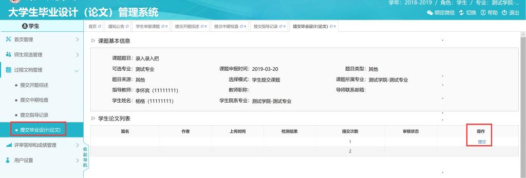 学生在对应的次数位置提交即可,提交后需要等待指导教师“确认检测”以及审核,第二次同样的方式