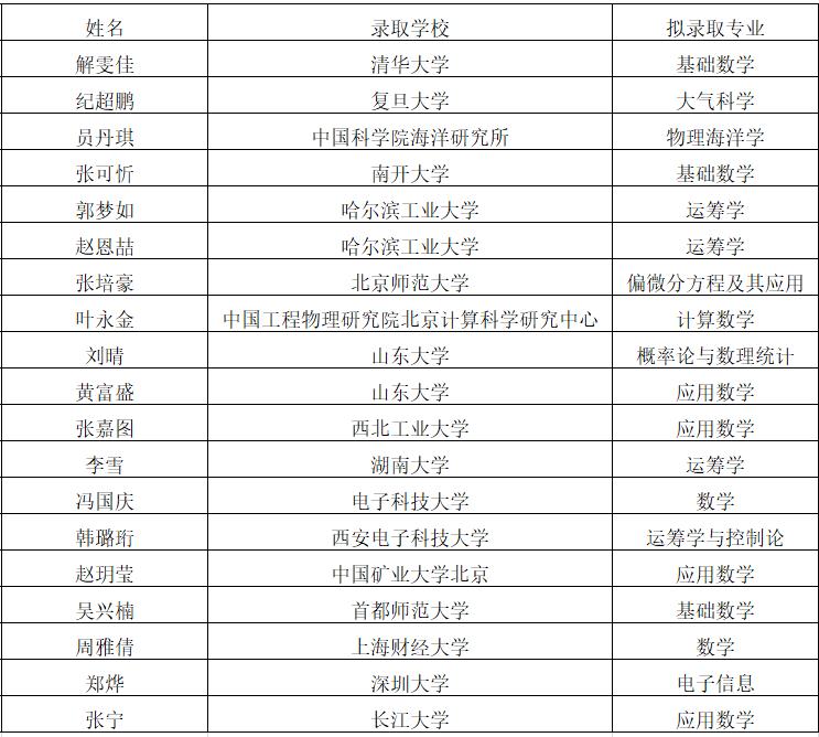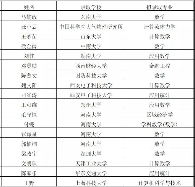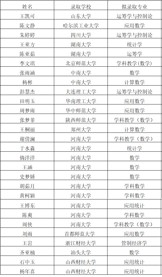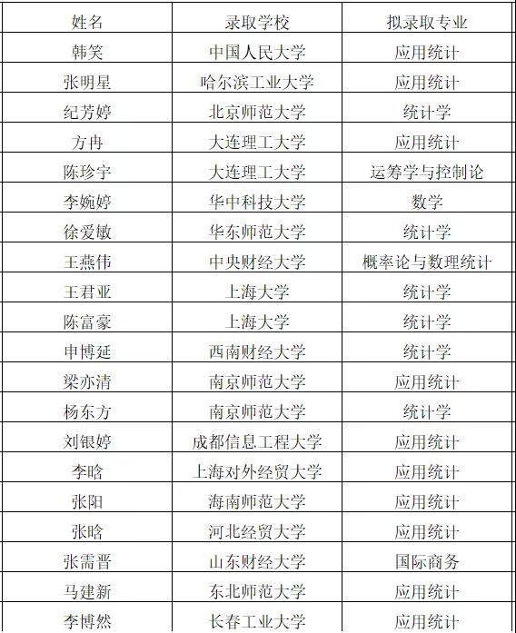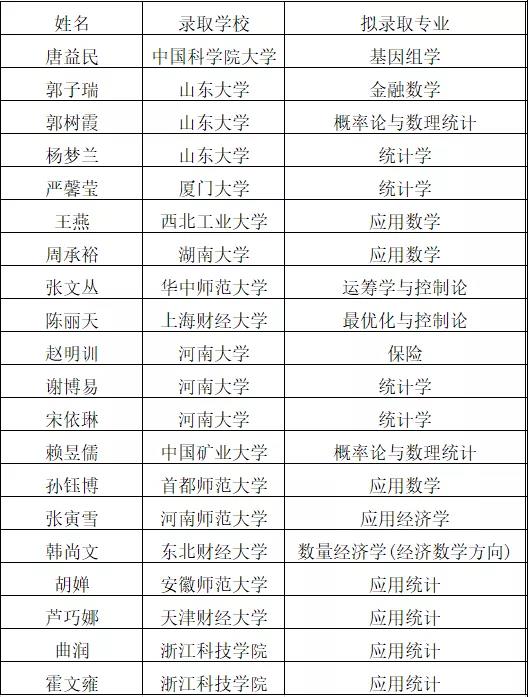其中共有105位同学考研成功,数学与应用数学(实验班)共有19人,数学与应用数学专业共有28人,信息与计算科学专业共有18人,统计学专业共有20人,金融数学专业共有20人。