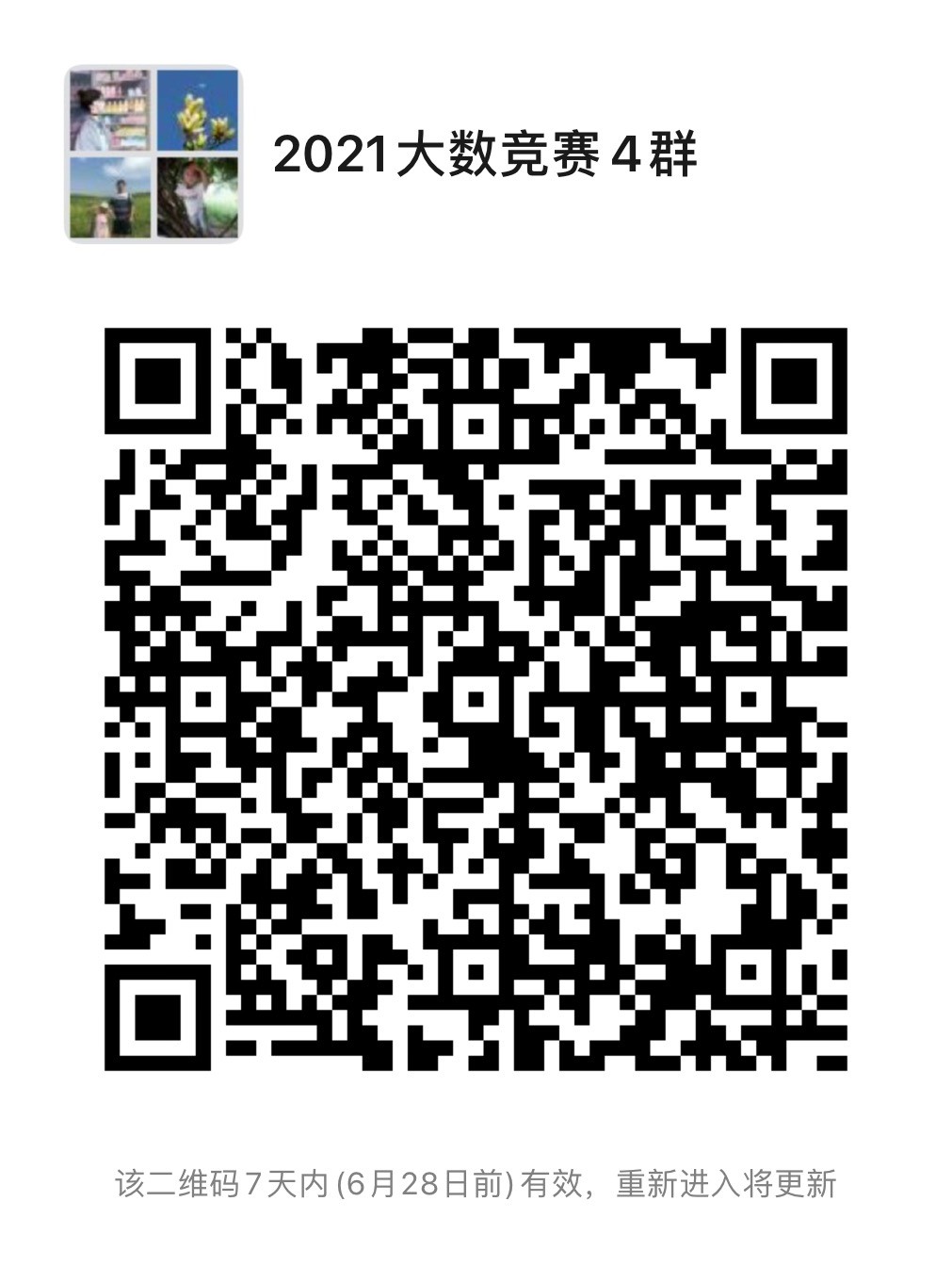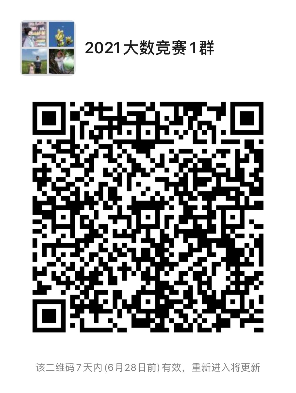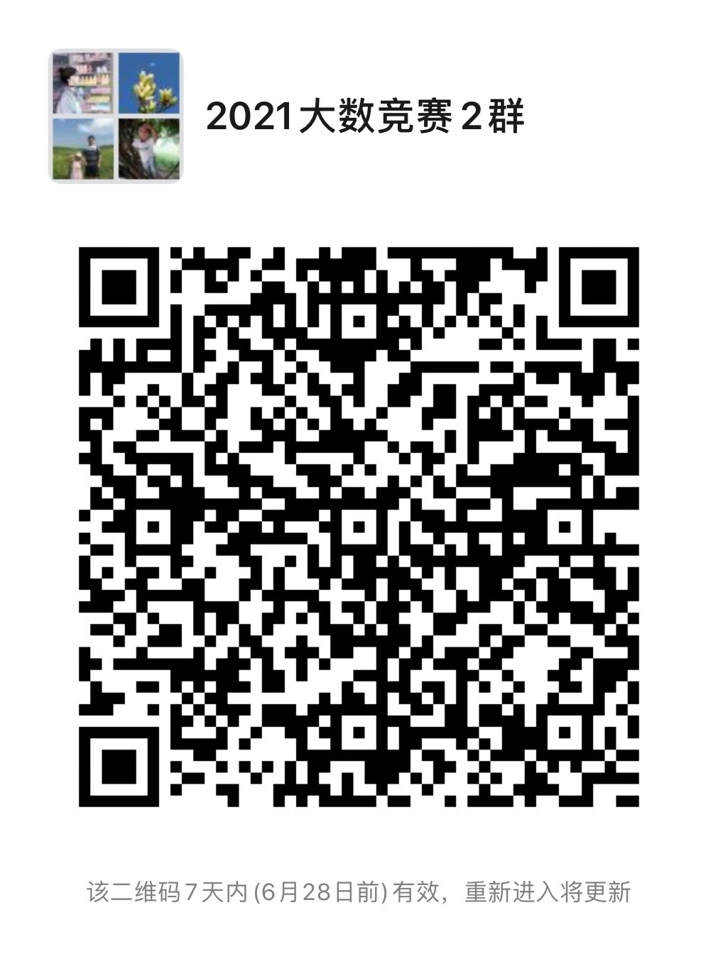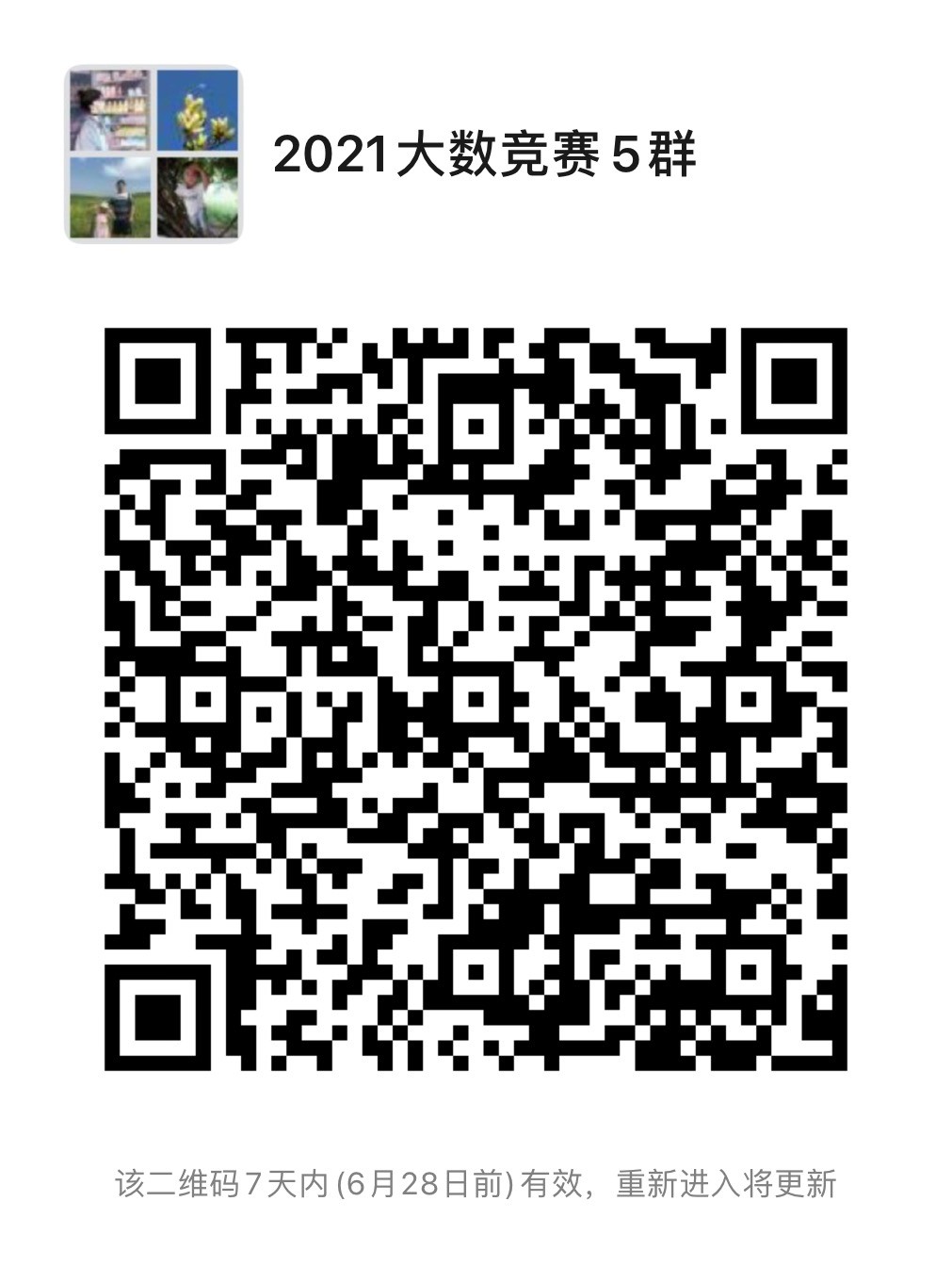 各相关学院要重视此次竞赛,认真组织,积极动员学生报名参赛。参赛学生请于2021年7月3日下午6点前加入微信群:数学专业组(加入大数竞赛微信5群)、非数学专业组(加入大数竞赛1,2,3,4群)(学生只能加入其中一个群且实名制,名称格式为:年级-学院-专业-姓名,如2018-学院-专业-刘某某)。以后有关竞赛的材料、培训安排及通知都在群里发布。