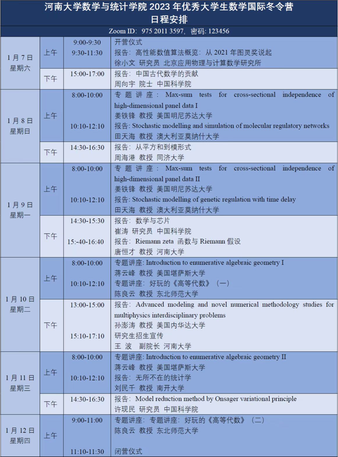 拟定于2023年1月7日—1月12日举办优秀大学生数学国际冬令营。本次冬令营计划在全国高校范围内招收100名数学、统计学及相关专业的高年级本科生,通过Zoom视频在线进行集中交流。