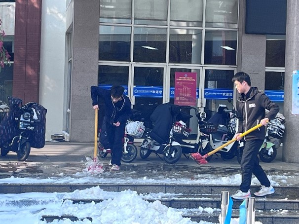 党委书记曹志伟、副院长杨一平等老师带领本科生、研究生50余名同学们进行铲雪除冰志愿活动。