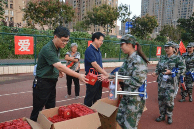 随后,学院领导为新生分发了精心准备的中秋月饼礼盒。中秋佳节本是团圆之时,学院的关爱也让离家的孩子们感受到了节日的温情。一个个精美的月饼,承载着学院对同学们的关爱与期望。学院领导还亲切慰问了负责我院军训工作的四位教官,对他们的辛勤付出表示感谢,并向他们致以节日的问候。