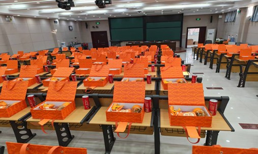 活动现场,学院还为学子们准备了满载关怀的考研大礼包,有寓意“心想事成”的橙子、定制“以笔为剑 一战成硕”字样的可乐等,尽显学院对考研学子的暖心关怀与殷切期许。
