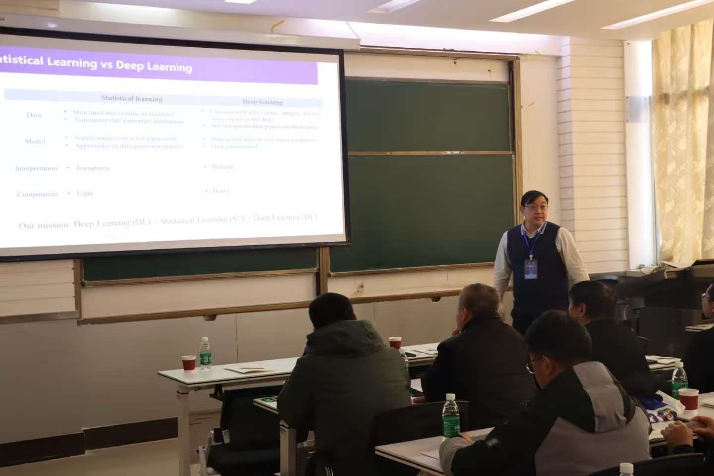 在学术报告环节,中国科学院李启寨研究员、清华大学邓柯教授、武汉大学涂志刚教授、华东师范大学刘玉坤教授和同济大学梁汉营教授、河南师范大学庞善起教授、郑州大学冯三营教授等专家学者从统计学科理论及应用的视角下,围绕生物医学统计、统计与人工智能协同、人工智能数据分析、分布偏移数据、高维分位数回归、正交表与量子信息、函数型数据分析等前沿问题,交流了最新的研究成果。