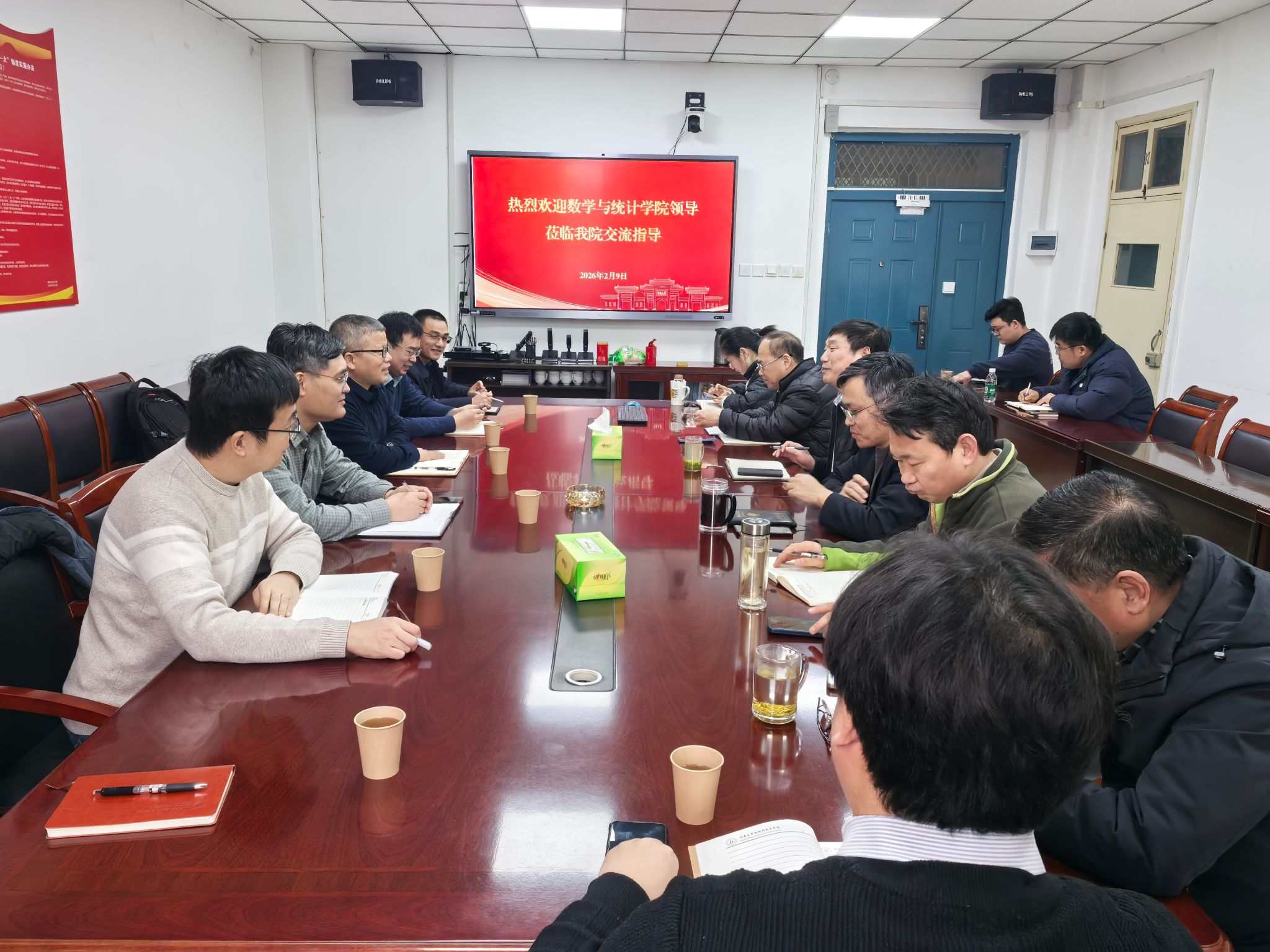 韩小森介绍了本院的学科优势、办学特色及近年取得的教学科研成果。他表示,此次调研旨在学习物理与电子学院在教育教学、人才引育、人才培养等方面的成熟经验,推动两院协同发展。曹志伟表示,数学、统计学科与物理电子学科联系紧密、互补性强,此次调研交流是双方党建与业务协同发展的重要开端,今后将深化教研团队共建,推动跨学科融合走深走实。