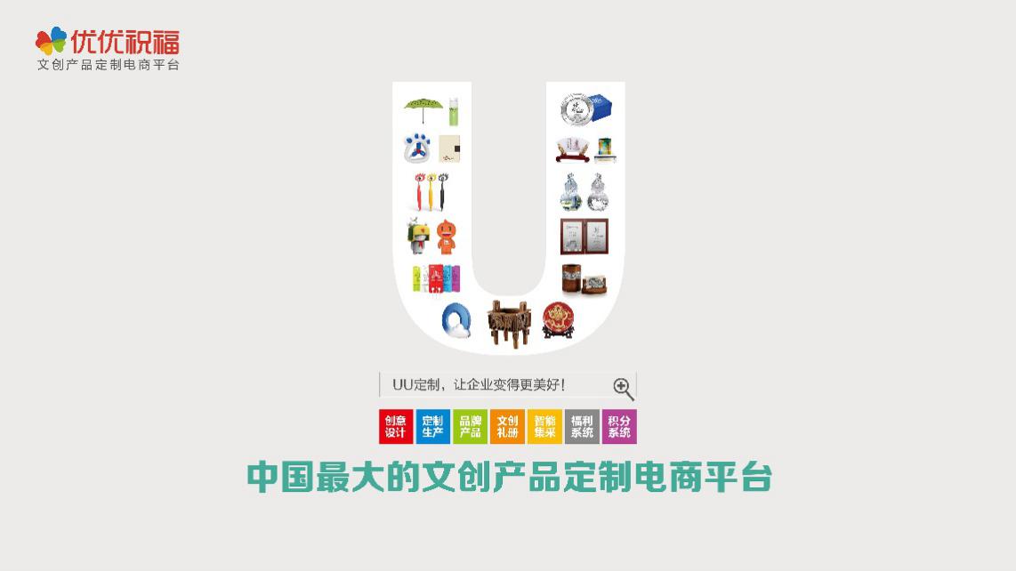 旗下优优祝福网(www.uuzhufu.com)是国内知名的B2B文创产品电商平台,通过独树一帜的创新商业模式,跨界整合国内外文创产业上游“创意设计、定制工厂和品牌厂商”等优质资源,为下游企业客户提供文创产品“策划咨询、创意设计、定制生产、品控质检、仓储配送”和“在线DIY设计、智能集采系统、积分系统和福利系统”等一站式个性化定制解决方案,真正解决了行业发展中的诸多痛点,让供给和采购阳光透明、智能高效、开源节流、事半功倍。经过多年的实践创新,优优祝福已经与数十家世界500强及国内上千家企业客户达成合作,其中包括阿里巴巴、华为、百度、腾讯、新浪、网易、中国移动、中国联通、民生银行、建设银行、家乐福、大众汽车等知名大企业。