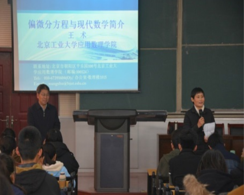 王术教授做了题为“偏微分方程与现代数学简介”的报告,院长冯淑霞主持报告会。