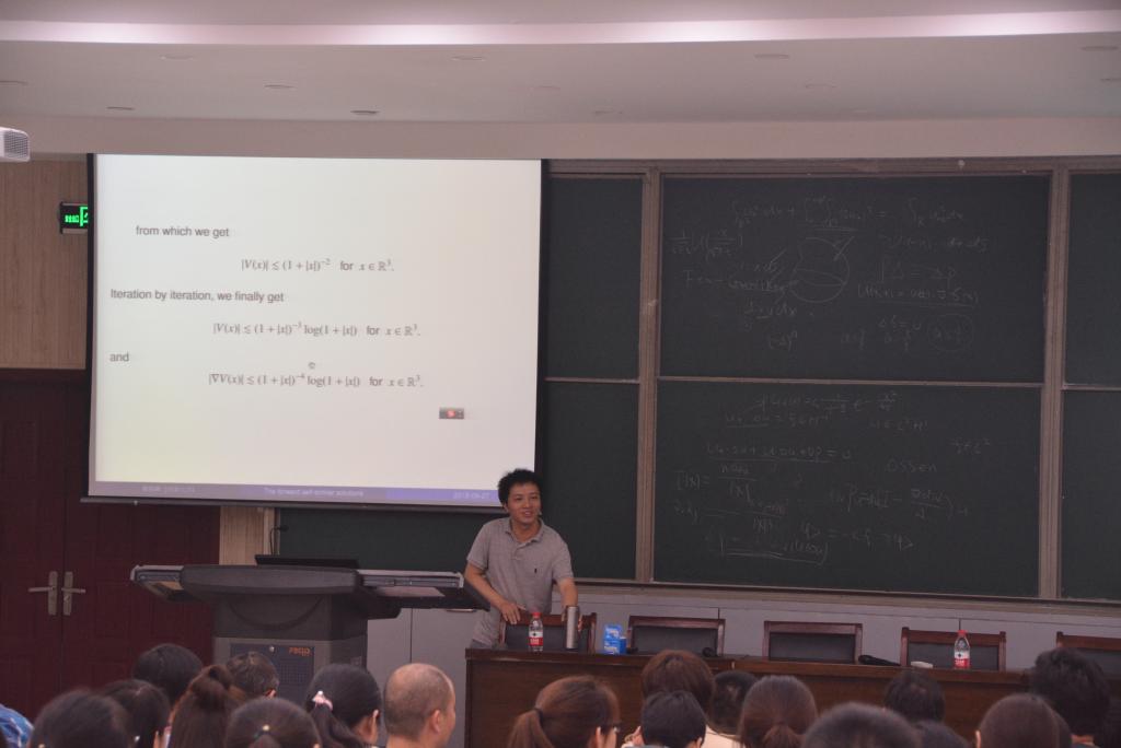9月27日下午,本学期的第一次活动在学院南阶梯教室举行,由偏微分方程方向教师代表赖柏顺副教授作了题为“The forward self-similar solutions of the incompressible 3-D Navier-Stokes Equations”的综述报告。赖老师首先介绍了上个世纪对三维不可压Navier-Stokes 方程的研究历史,以及该问题成为克雷研究所的七个千禧年问题(所对每个问题悬赏100万美元征集答案)之一的原因;然后,又介绍了国际上主流学派对于Navier-Stokes方程的关注点以及最新进展。最后,他介绍了本人与合作者对于该方程取得的最新成果以及一些备受学术界关注的公开问题。与会老师、学生和赖老师就Navier-Stokes 方程的有关问题进行了热烈讨论。
