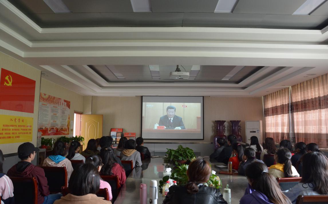 党委书记史富强、党委副书记、院长冯淑霞、党委副书记赵红磊同部分青年教师、共青团干和共青团员代表在学院二楼会议室一起集中收看了大会直播。