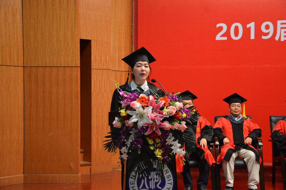 韩莹作为毕业生代表首先发言,她满怀深情地讲述四年的校园生活与感悟,表达着对师生情的感恩与对同学情的留恋。她表示:我们一定秉承“明德新民,止于至善”的校训,勇于担当,用我们的所学、所长,为这个社会谱写更动听的乐章,用我们的努力与成功回报社会,回报母校。