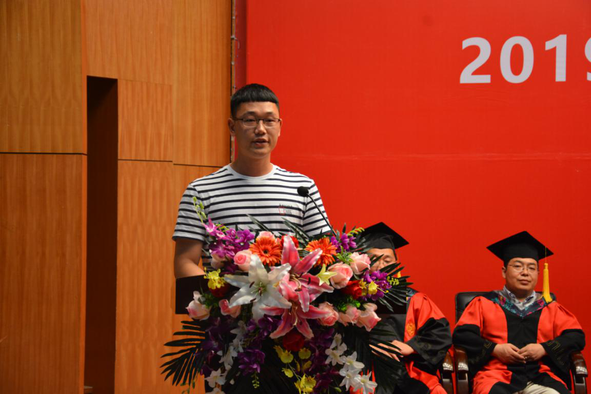 院学生会主席、2016级学生杨彬代表在校生通过分享“羡慕”、“感谢”、“祝福”、“回家”四个词向即将离开母校的毕业生送上最热烈的祝贺、最真诚的感谢及最诚挚的祝福,并承诺以学长学姐为榜样,用优异成绩和实际行动回馈母校。