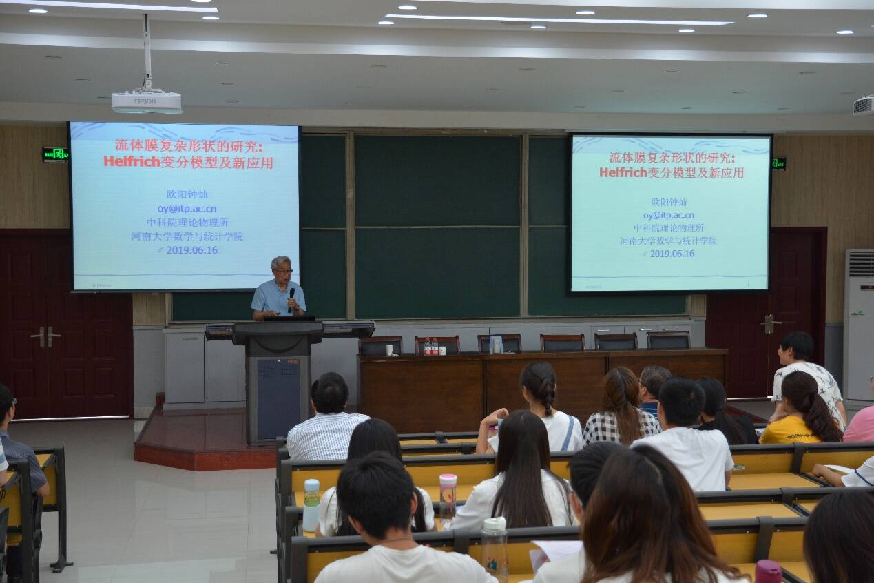 二楼南阶梯教室欧阳院士作了题为“流体膜复杂形状的研究:Helfrich变分模型及新应用”的学术报告。报告会由正妹av
