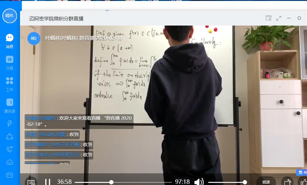叶嵎林老师讲授迈阿密学院中外合作办学的《微积分》双语课程,为了保持双语教学的延续性,他就自己想办法购置了教学白板,借助钉钉平台进行直播教学。学生普遍认为教学效果良好,“看的清楚,也听的清楚,不用抢座位,不明白的地方还可以多次回放观看”。