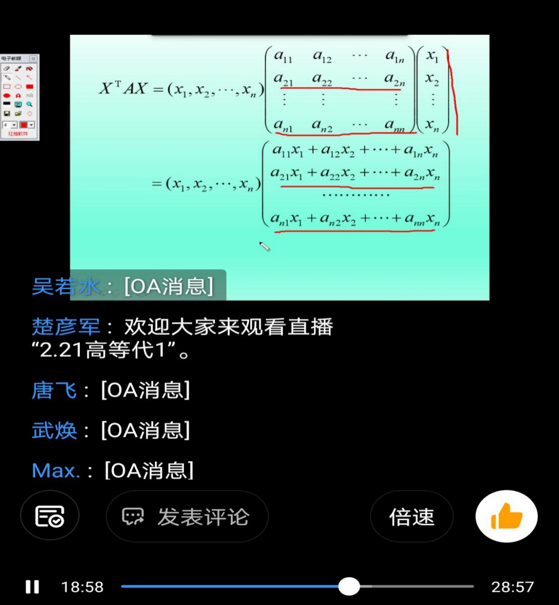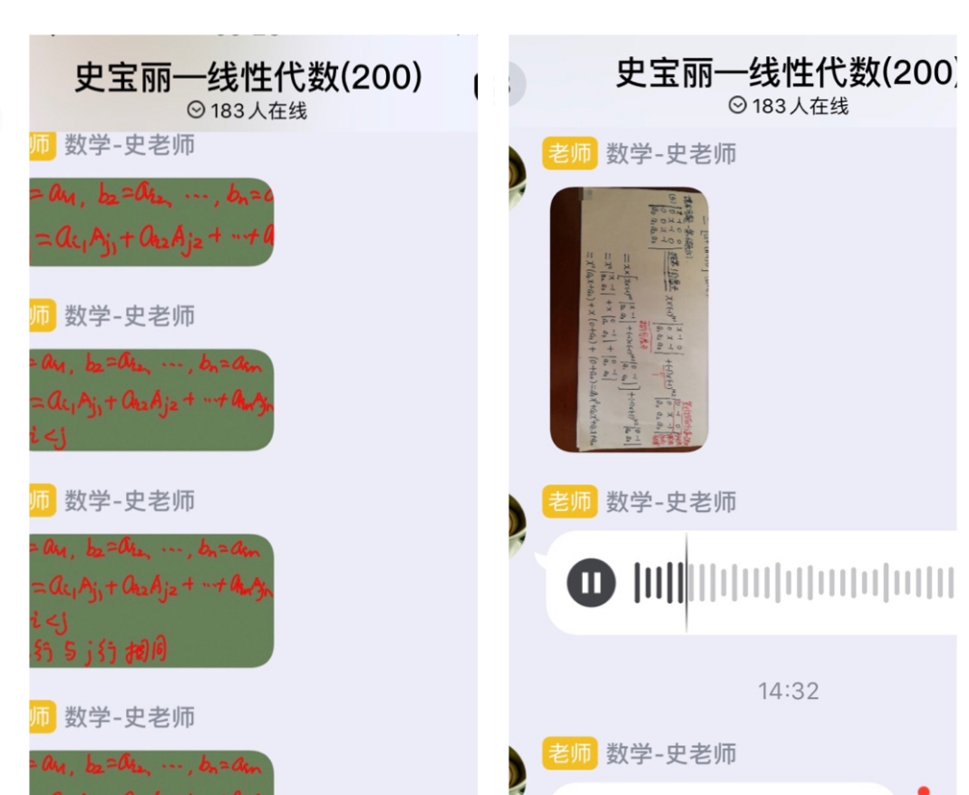 楚彦军和侯波两位老师本学期共同讲授《高等代数》课程,由于课程的专业性特点,网上合适的慕课资源较少,所以两位老师花了很大的功夫自己动手做了PPT课件,考虑到板书的不便,为了便于学生接受,课件做的特别详细,也特别认真。在使用钉钉课程直播中还专门给学生留下答疑时间,给学生布置问题并留几分钟的答题时间,让学生把解答照片发到互动消息框,这样就可以随时掌握学生听课效果,也能科学的把握教学进度并做好过程性评价。