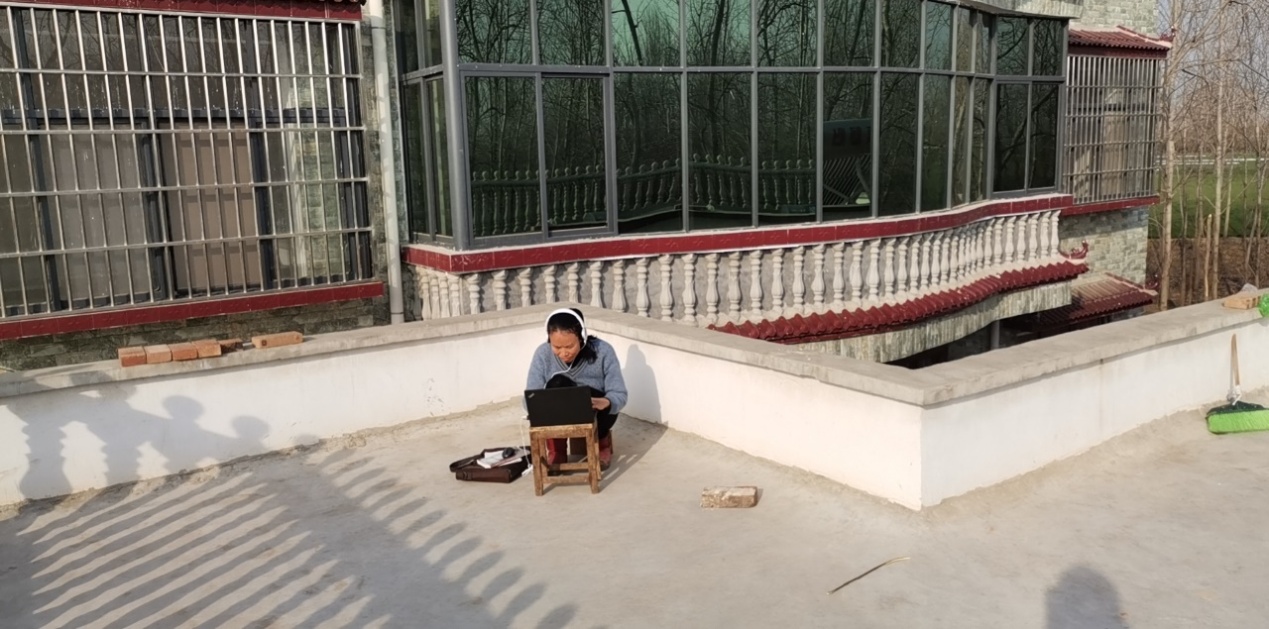 王玲娣老师本学期讲授《数理统计》课程。由于假期回到农村老家,老家没有教材教案,没有网络,也没有独立的直播空间和直播设备,只带了一台笔记本电脑。接到学校线上教学任务后,马上自己在网上购买了教科书和必须的直播设备。上课时就搬了一个小板凳坐在邻居家的屋顶,蹭邻居家的网络开展教学工作。直播教学过程中经常遇到家里孩子哭闹、网络不通畅、笔记本电脑长时间使用亏电等等困难,但她始终认为无论如何,不能耽误给学生上课。
