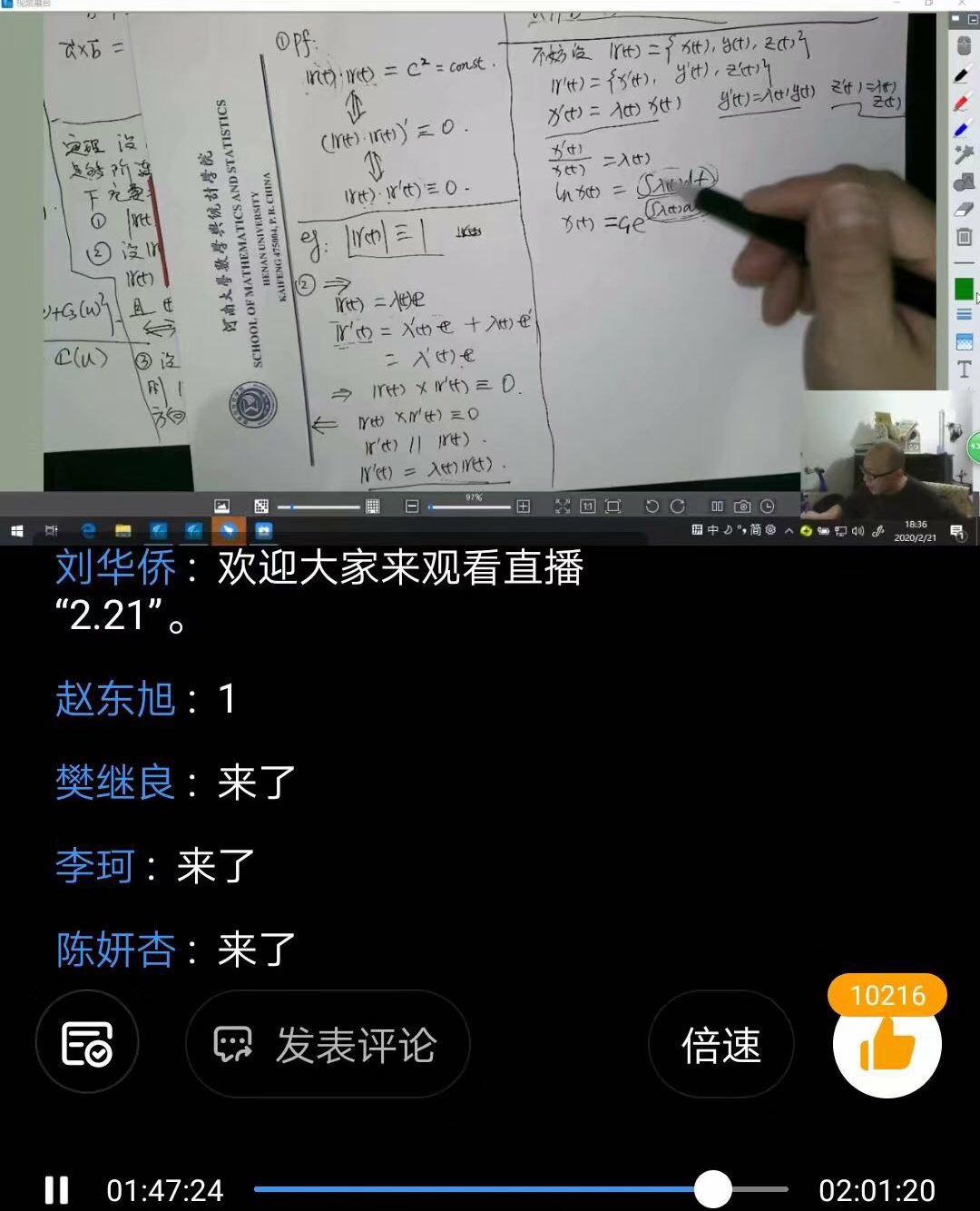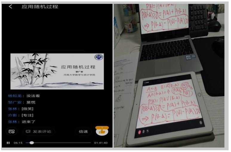金融数学系的邹广安老师,利用钉钉直播平台,采用IPAD和电脑相结合的方式,为学生带来了精彩的《应用随机过程》课。结合PPT课件和IPAD手写板,能随时增加板书内容,为学生现场解惑,学生反映效果良好。