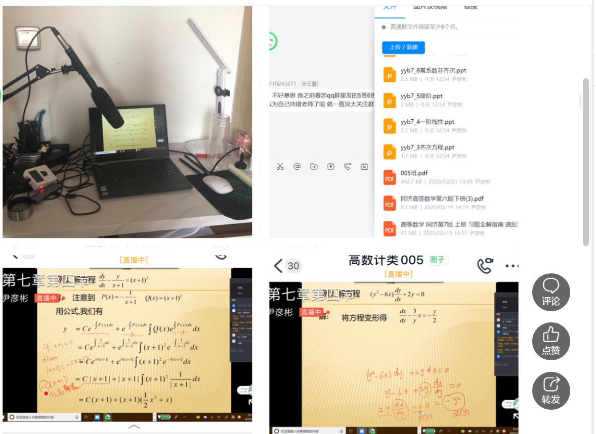 尹彦彬老师是学院的教务办主任,除了协调安排为老师们做好线上教学服务工作之外,还承担了《高等数学》和《中学数学教师职业技能训练》两门课程的教学任务。为了保证线上教学效果,自己网上采购了一套较专业的录播设备,包括外置声卡、外置麦克风、手写触摸屏笔记本,并对各个教学平台都进行了细致深入的摸索,获得了不错的直播效果。