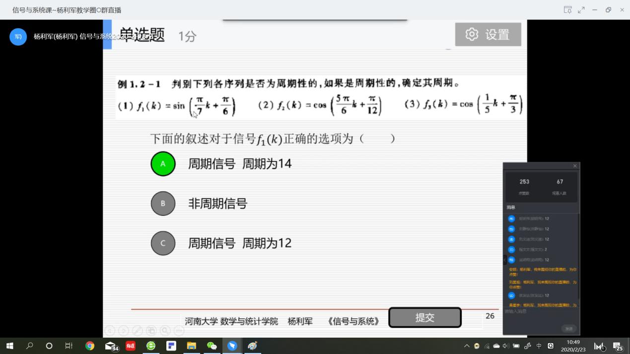 杨利军老师本学期讲授《信号与系统》和《模式识别与图像处理》两门课程,她课前准备了多种教学平台使用预案,上课时发现雨课堂系统不能登陆以后,马上改用钉钉教学平台进行教学,保证了课堂教学顺利进行。“我是在公告栏发布作业通知,在钉钉班级圈里发布课程相关的通知,也可以发起签到,直播效果也挺好,整个过程流畅,课堂上也有互动,从学生回答问题的情况看,学生确实认真听了,也积极思考了!而且直播后有详细的学生学习的数据可以导出,还可以在日程里添加课程打卡,可以记录学生打卡情况,也很方便。下一步将探索如何实现同步公式推导,来更好的促进教学,提高教学质量。”
