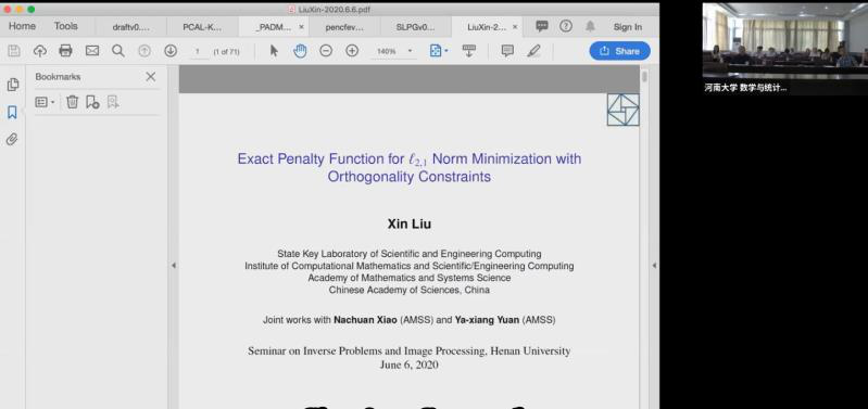 会议期间,各位专家学者围绕反问题和图像处理中的理论和(优化)算法等相关问题及研究前沿展开了广泛的交流,并就发展趋势和当前存在的问题进行了深入的讨论。本次线上研讨会为图像处理领域的相关专家学者提供一个了解该领域前沿动态及互相交流最新研究成果的平台,同时也为我院举办相关线上学术活动积累了宝贵经验。