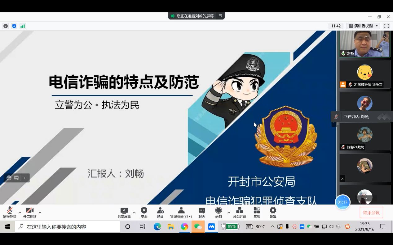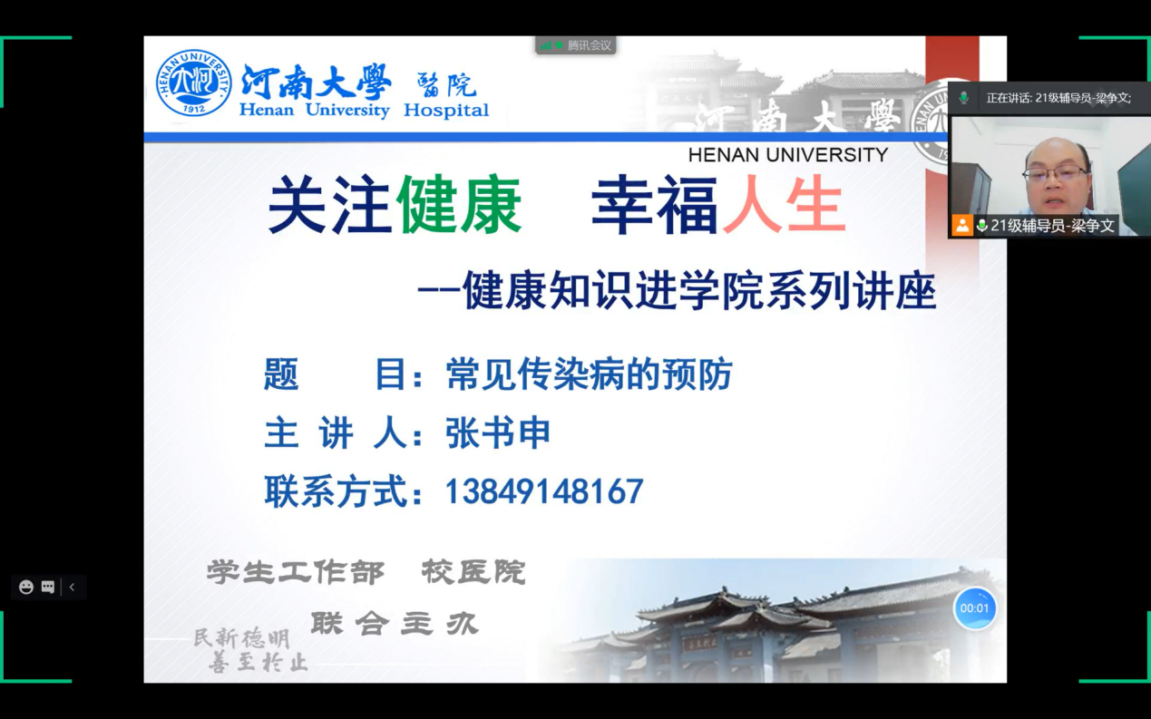 学院还邀请到校医院副院长张书申、心理健康教育与咨询中心张典、开封市公安局电信诈骗犯罪侦查支队三大队大队长刘畅分别为同学们开展常见传染病的预防教育、心理健康教育和电信诈骗警示教育,帮助同学们正确预防新冠病毒和常见传染病,引导他们以良好的心态面对新的学习和生活环境,降低他们被电信诈骗蒙蔽的概率,为新生做好各方面的安全健康教育。