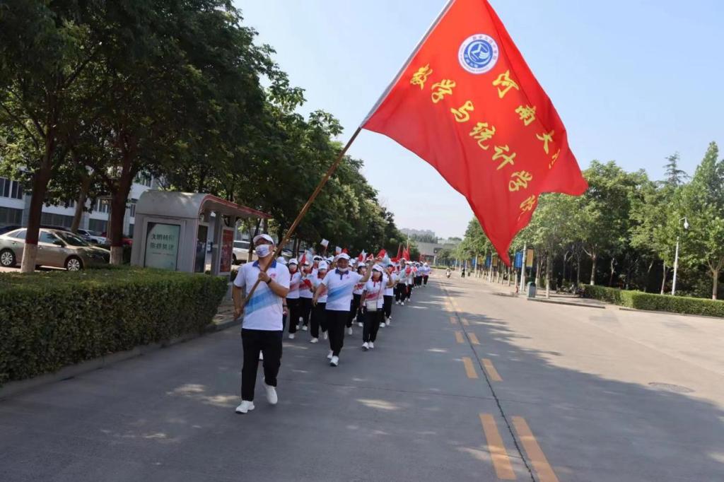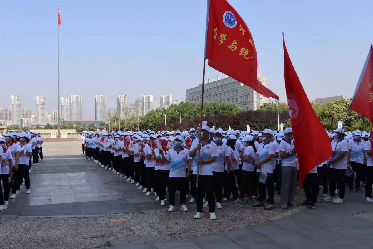 活动开始前,参与活动的老师在学院集合后,列队行进至金明校区图书馆广场,与其他单位教师一起等候活动开始。老师们身着纪念服饰,手拿国旗和活动旗帜,洋溢着幸福的笑容,渴望着用自己的脚步表达自己内心的喜悦。