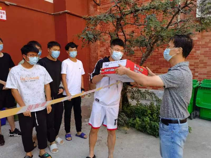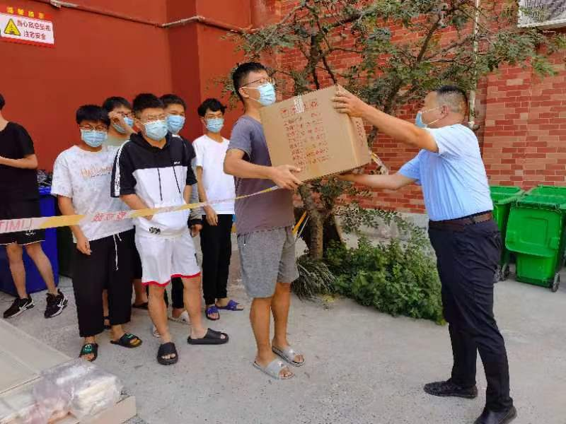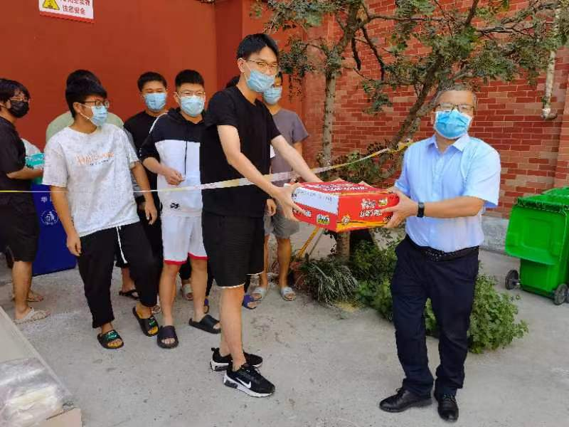 党委书记史富强、院长韩小森、党委副书记赵红磊、2020级辅导员安其丰来到南苑4栋学生公寓前,为我院20级隔离学子送去关爱礼包,并鼓励他们积极配合疫情防控工作,保持良好的心态,安心平稳的度过观察期。