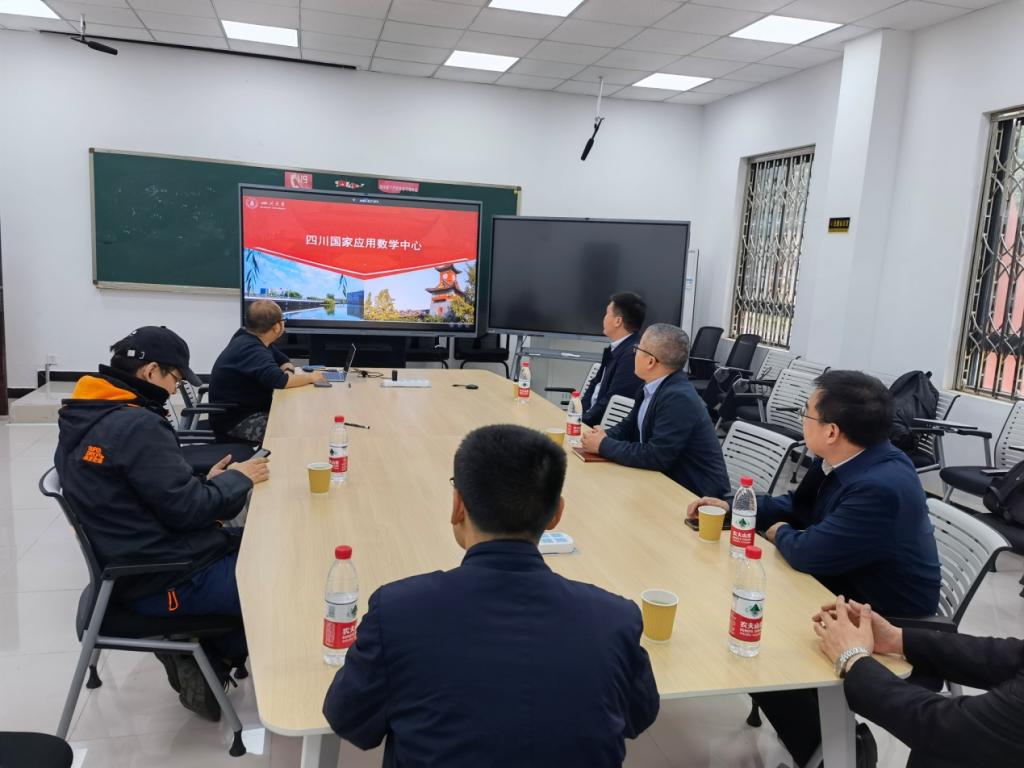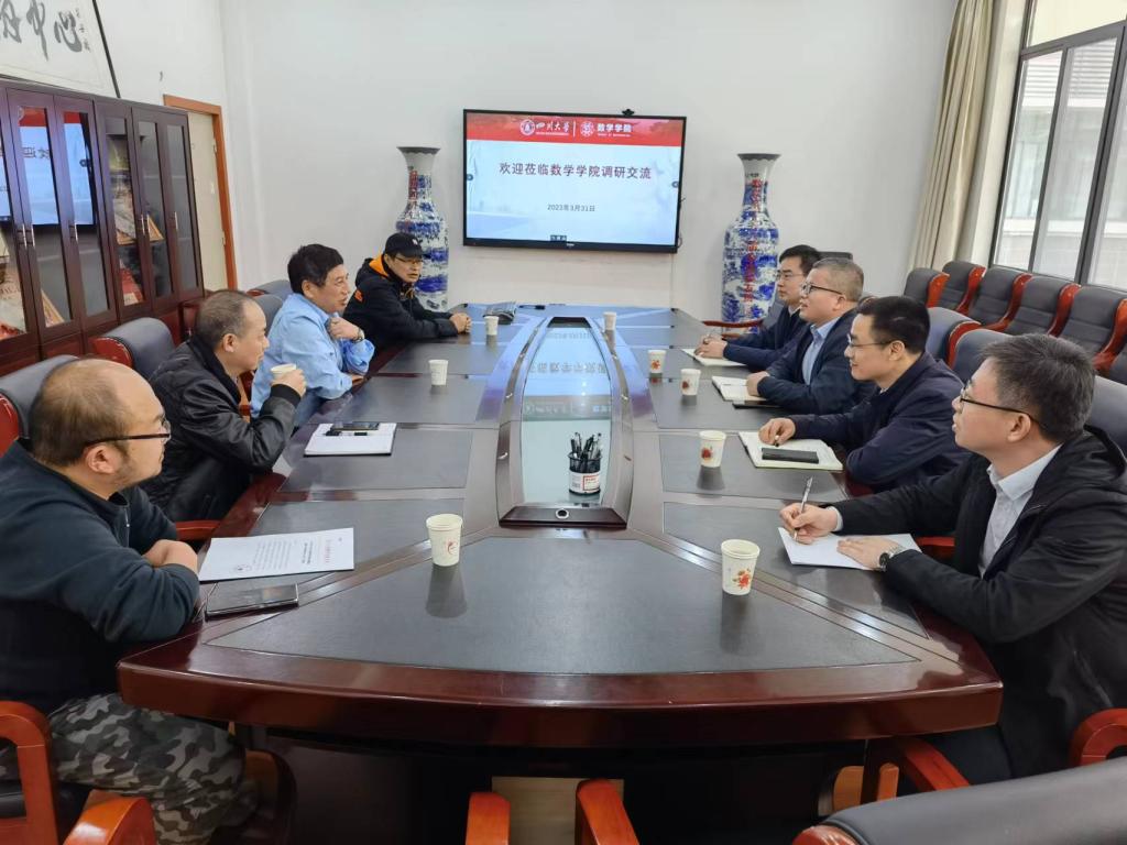 一行5人在院长韩小森带领下赴四川大学数学学院调研交流。四川大学数学学院院长王宝富,副院长连增、寇辉,四川国家应用数学中心管理办公室主任邓科等热情接待了调研组一行并进行了座谈交流。