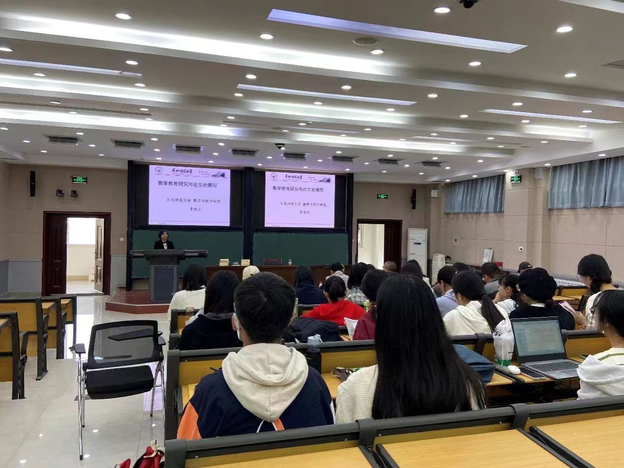 第一场报告,李淑文教授从数学教育教学研究的意义和原则、选题方法、选题领域、数学教育论文的结构与撰写等方面为我们作了精彩的报告,得到了与会师生的广泛认同,整个报告会气氛轻松愉快。
