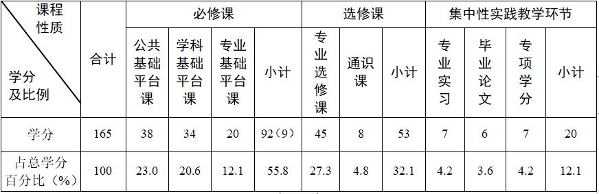 毕业总学分为165学分,其中必修课92学分(公共基础平台课38学分,学科基础平台课34学分,专业基础平台课20学分);选修课53学分(专业选修课45学分,公共选修课8学分);实践性教学环节20学分(其中专项学分7学分)。