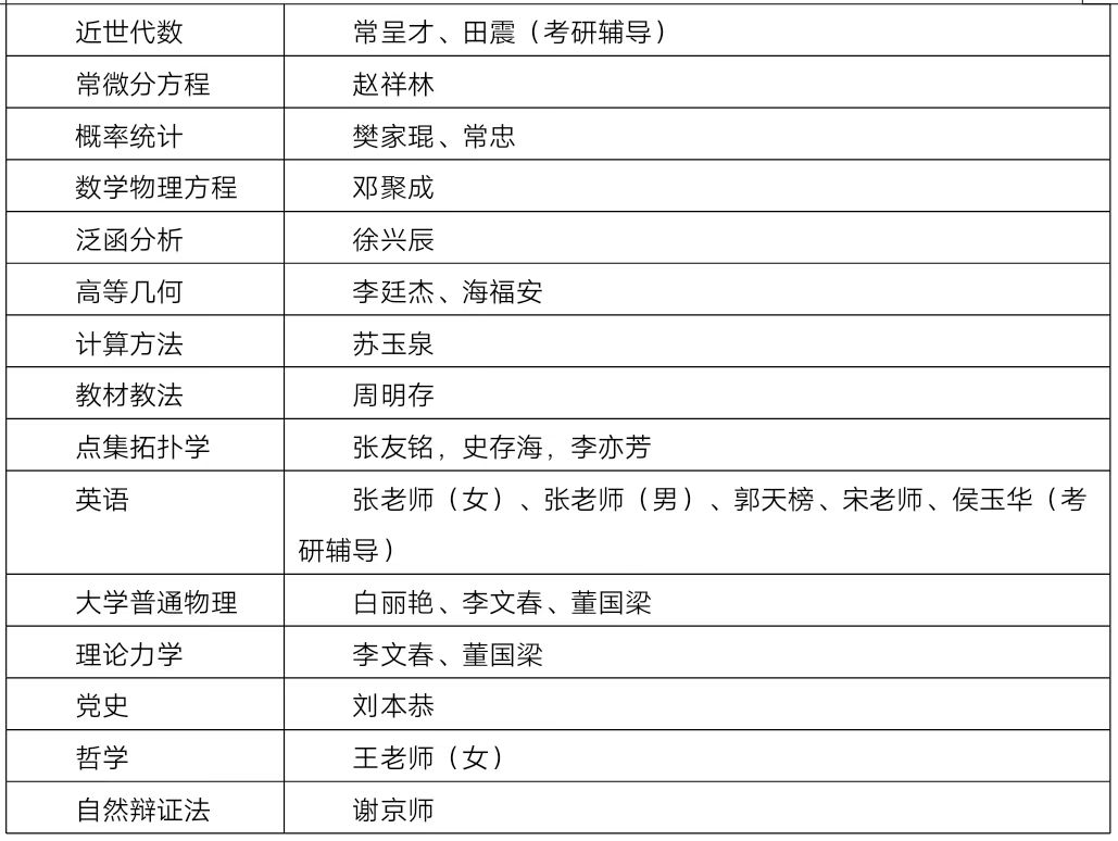 高志芬老师,嗓音洪亮,板书流利工整。李廷杰老师,高挑消瘦,课间总是吸一支烟提振精神。常呈才老师上课开朗活泼,喜欢和学生互动。 吴瑞杰老师讲课时,爱眯着眼思考问题一会儿再讲解。徐兴辰老师上课,写起板书一笔一划,然后退一下讲台,仔细端详自己的板书,满意了继续上台书写、讲解。王复兴老师讲课,表情严肃,话不多说。贾兴琴老师辅导尽心认真,每道题的证明写得密密麻麻,详实具体。苏玉泉老师上课嗓门洪亮,京腔十足。海福安老师刚参加工作,个子高挑,腼腆内向。张友铭老师,同学张扬的父亲,只给我们讲过一段时间《点集拓扑学》,面色红润,板书整齐流畅。史存海老师接下张老师的课,继续教我们,他跟随刘亚星教授攻读硕士学位,学术水平不可小觑。李亦芳老师,79级留校任教,和史老师搭帮上习题课,声音洪亮,板书流利工整,后调到华北水电大学工作。周明存老师讲课,低调内敛,声音不是太高,后来到了教务处搞教学管理了。邓聚成老师郑州大学硕士毕业,后来和我都是搞偏微分方程研究的,板书流利通畅,学问深厚,在学业上经常指导我。