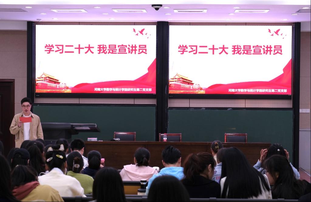 为全面深入学习宣传贯彻党的二十大精神,3月30日晚上,数学与统计学院研究生第二党支部开展了“学习二十大·我是宣传员”主题党日活动。学院党委副书记赵红磊、支部党员同志和入党积极分子参加活动。