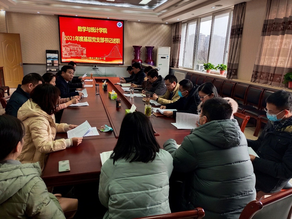 为深入学习贯彻习近平新时代中国特色社会主义思想和党的十九届六中全会精神,落实学校党委的工作部署,持续推进支部规范化、标准化建设,充分发挥党支部战斗堡垒作用,夯实基层党建工作基础,12月31日下午,数学与统计学院在二楼党建活动室召开2021年度基层党支部书记党建工作述职评议考核会议。学院全体党委委员、领导班子成员和各党支部书记参加会议。会议由院党委书记史富强主持。