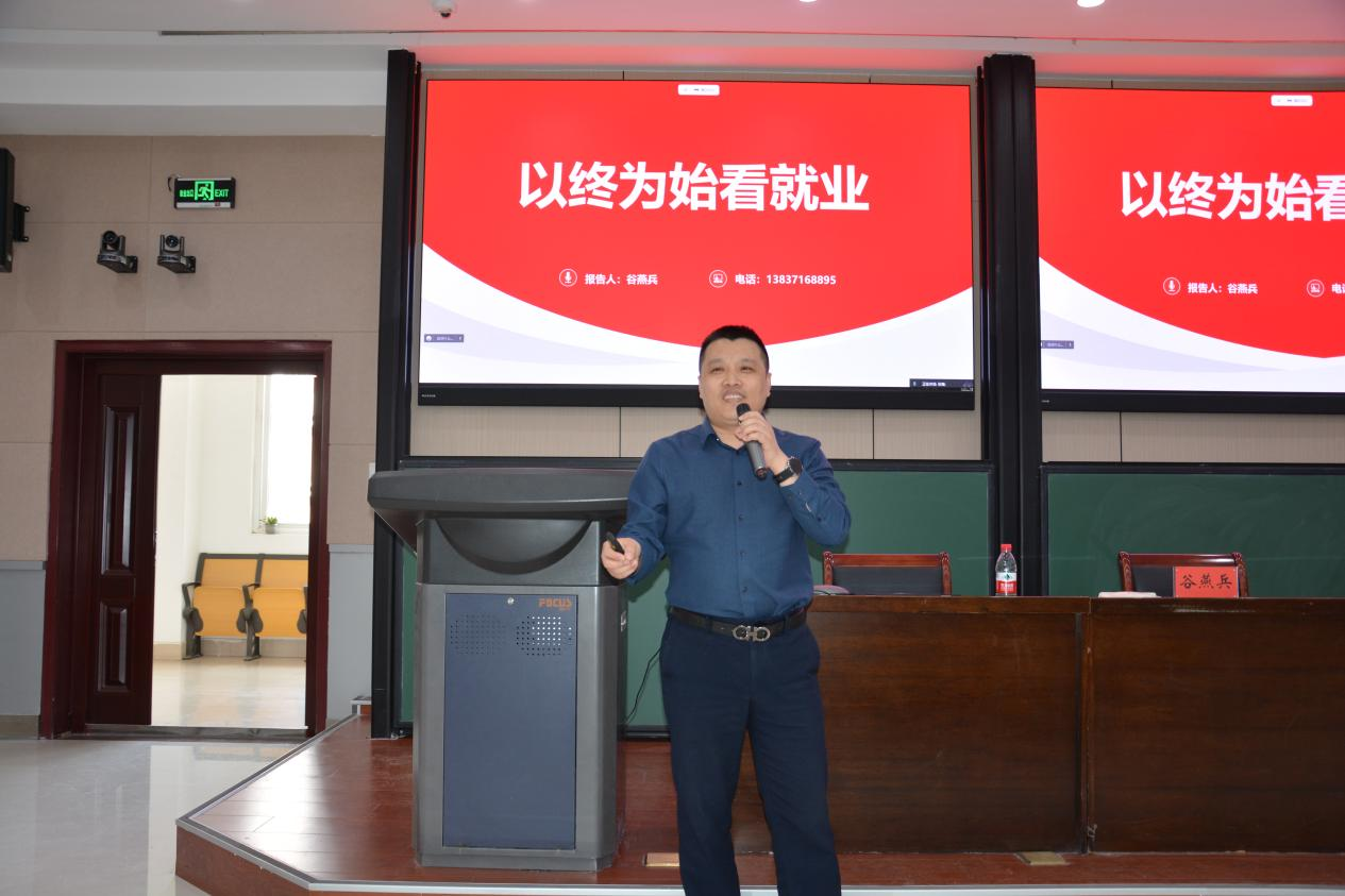 4月6日下午,河南数安科技有限公司总经理,河南大学数学系94级校友谷燕兵受邀在数学与统计学院二楼南阶教室作题为《以终为始看就业》的就业指导报告。学院党委副书记赵红磊,辅导员吴苏苏、安其丰、贾丽冰及200余名本科生代表线下参加,其余学生线上参会。会议由赵红磊主持。