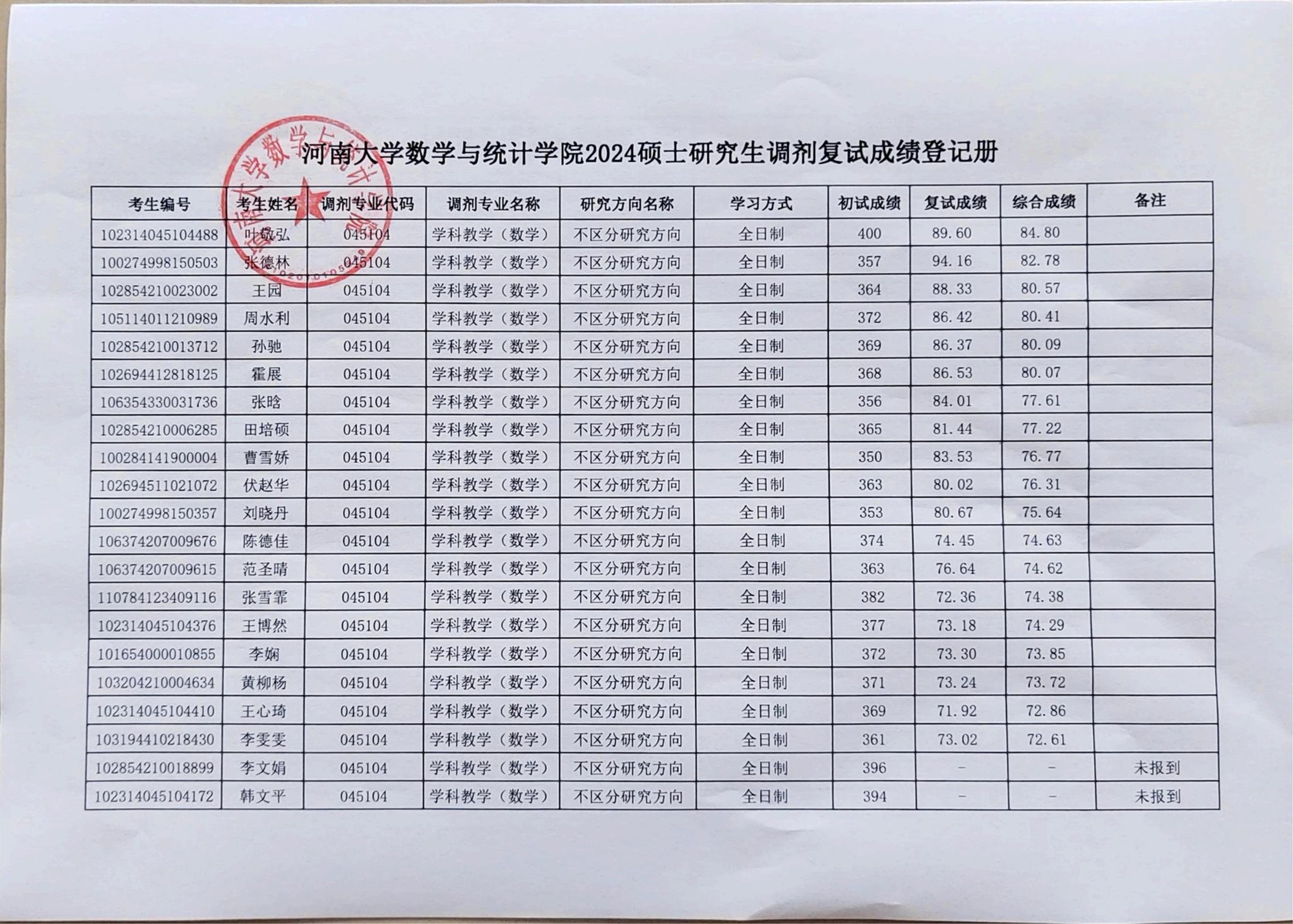 河南大学数学与统计学院2024硕士研究生调剂复试成绩登记册