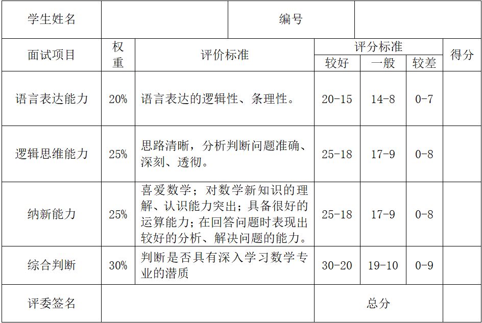 2.考试考核:采用笔试和面试的方式相结合的方式进行综合素质测试。笔试部分主要就《高等数学》的基础知识进行闭卷考试,考试时间2个小时,满分100分。面试由学院选取的领导组全体成员作为评委,主要就学生的专业兴趣、知识结构、创新意识、应变能力、心理素质等方面进行综合测评。最后对每位应试者单向加综合打分(评分表见附件)。