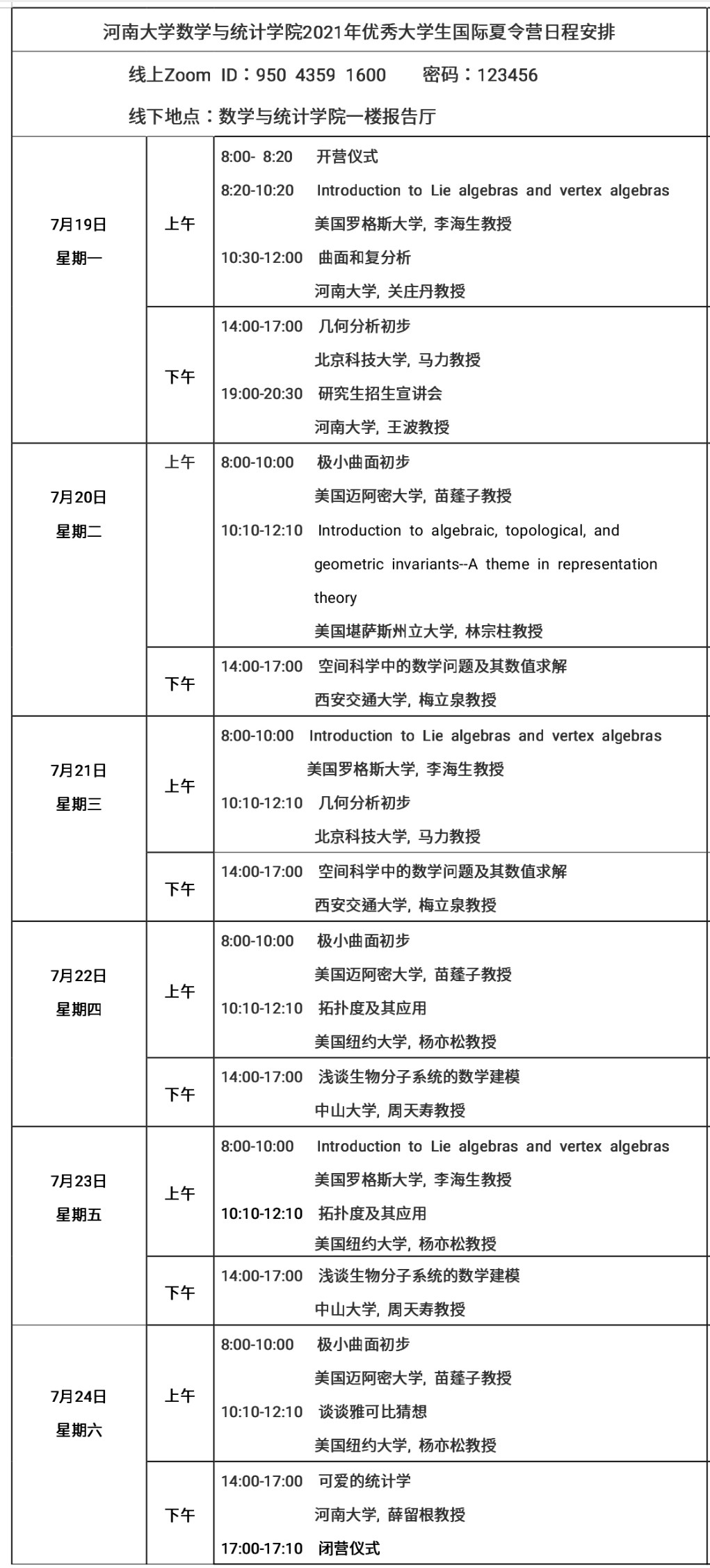 为促进高校之间优秀大学生的交流和互动、为给学生提供一个了解数学、统计学科各个方向最新前沿动态的机会,河南大学数学与统计学院拟定于2021年7月19日—7月24日举办大学生数学夏令营。本次夏令营计划在全国高校范围内招收100名数学、统计学及相关专业的三年级本科生,采用线上线下相结合的方式进行集中交流。