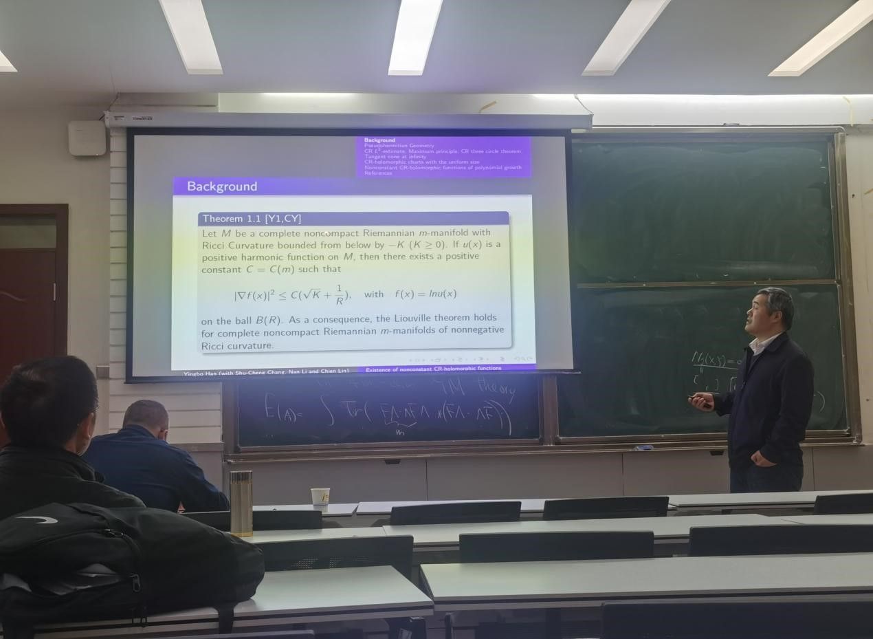 韩英波介绍了他与合作者利用Cheeger-Colding理论,在Sasakian流形的一列穷竭域上构造了具有可控增长的CR-全纯函数,随后,他介绍了通过无穷远处切锥的CR analogue和三圆定理,利用子序列可以得到一个多项式增长的非常数CR全纯函数。