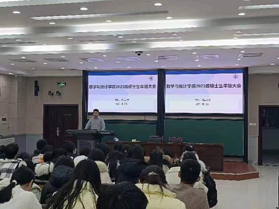 1月5日下午,数学与统计学院2023级研究生辅导员陈顺杰在南阶教室召开2023级研究生年级大会,此次会议聚焦防范学风建设、电信诈骗以及寒假安全教育等专题,给2023级研究生同学进行全面地阐释和有效引导。2023级全体硕士研究生参加大会。