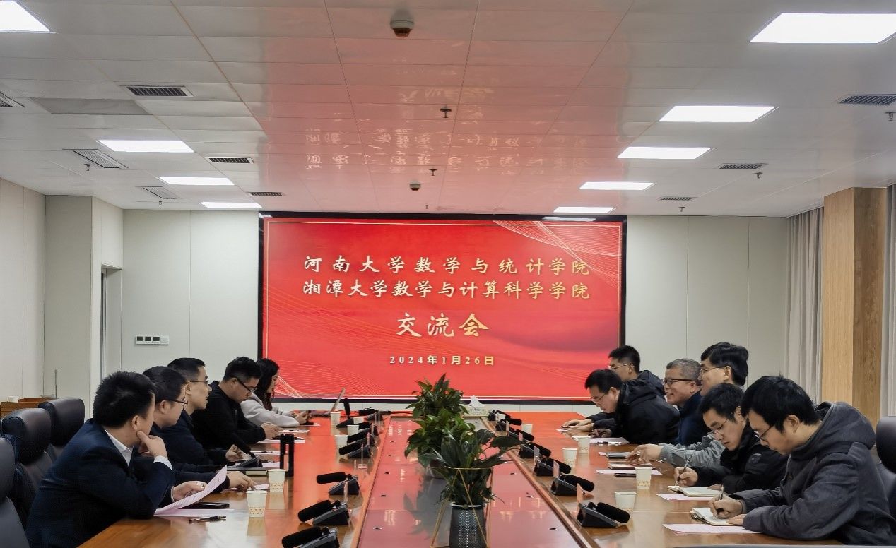 为进一步加强学科建设与发展,增进兄弟院校之间的交流互动,推动学院高质量发展,1月26日,数学与统计学院党委书记曹志伟、院长韩小森等一行六人赴湘潭大学数学与计算科学学院调研交流。湘潭大学数学与计算科学学院党委书记张普、院长杨银、湖南国家应用数学中心行政副主任黄牛武、副院长易年余、袁海专、张娟、党委副书记田坤等热情接待了调研组一行并进行了座谈交流。