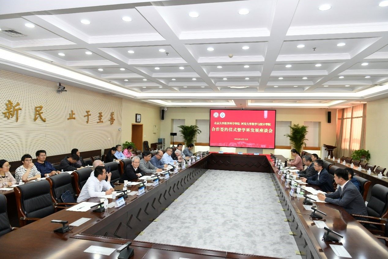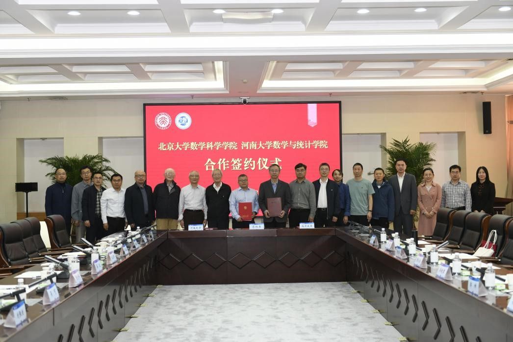 北京大学数学科学学院院长陈大岳,党委副书记、副院长孙赵君,河南大学副校长薛波,国内合作办公室主任毛立群,数学与统计学院党委书记曹志伟、院长韩小森、学院教师代表共同出席签约仪式。签约仪式由毛立群主持。