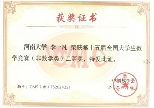 经过激烈角逐,我校10名参赛同学取得了2个二等奖,8个三等奖的优异成绩。在本届竞赛中,数学与统计学院李望龙以河南省第一名的好成绩获得专业组(高年级组)二等奖;杨桂颜、韦萍萍、代维嘉、杜鑫宇获得专业组(高年级组)三等奖;巩启超获得专业组(低年级组)三等奖;李一凡获得非专业组二等奖;郑广豪、屠玉涛、周柄材获得非专业组三等奖,河南省数学会获评“优秀赛区组织奖”;河南大学获评“优秀高校组织奖二等奖”。