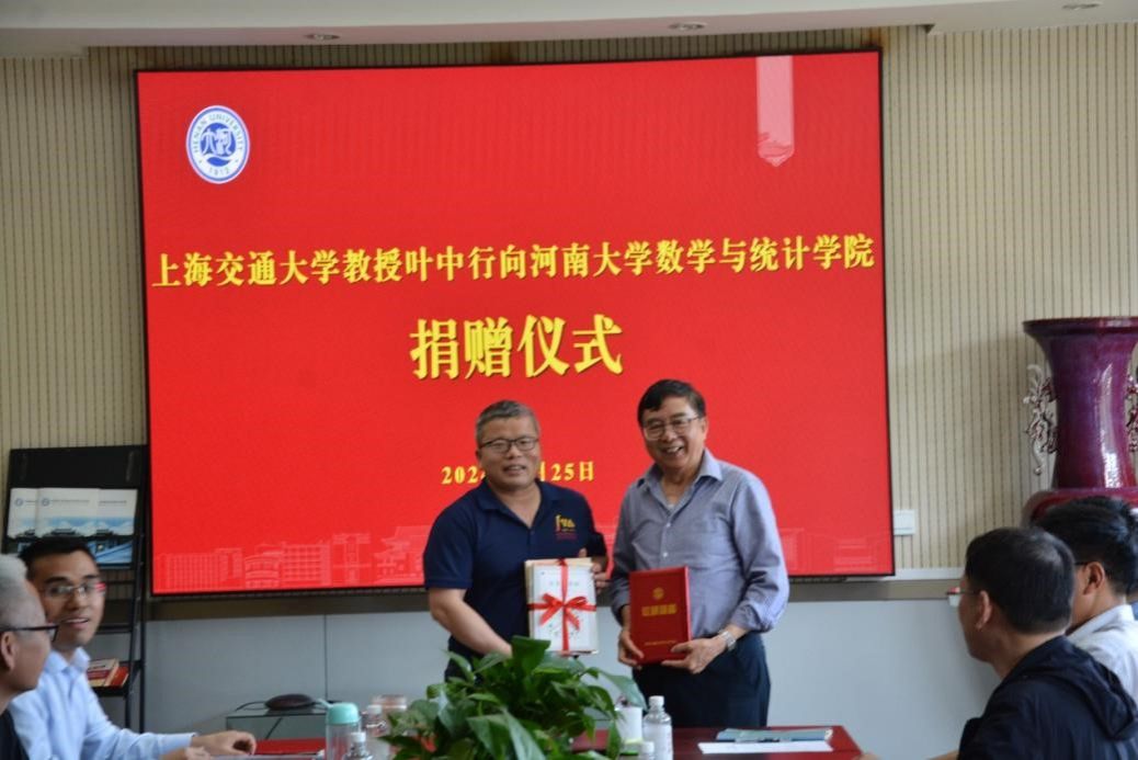 在随后举行的捐赠仪式上,叶中行教授向学院捐赠了近年来在金融数学领域最新出版的6本专著,韩小森代表学院接受捐赠,并向叶中行教授颁发了捐赠证书。