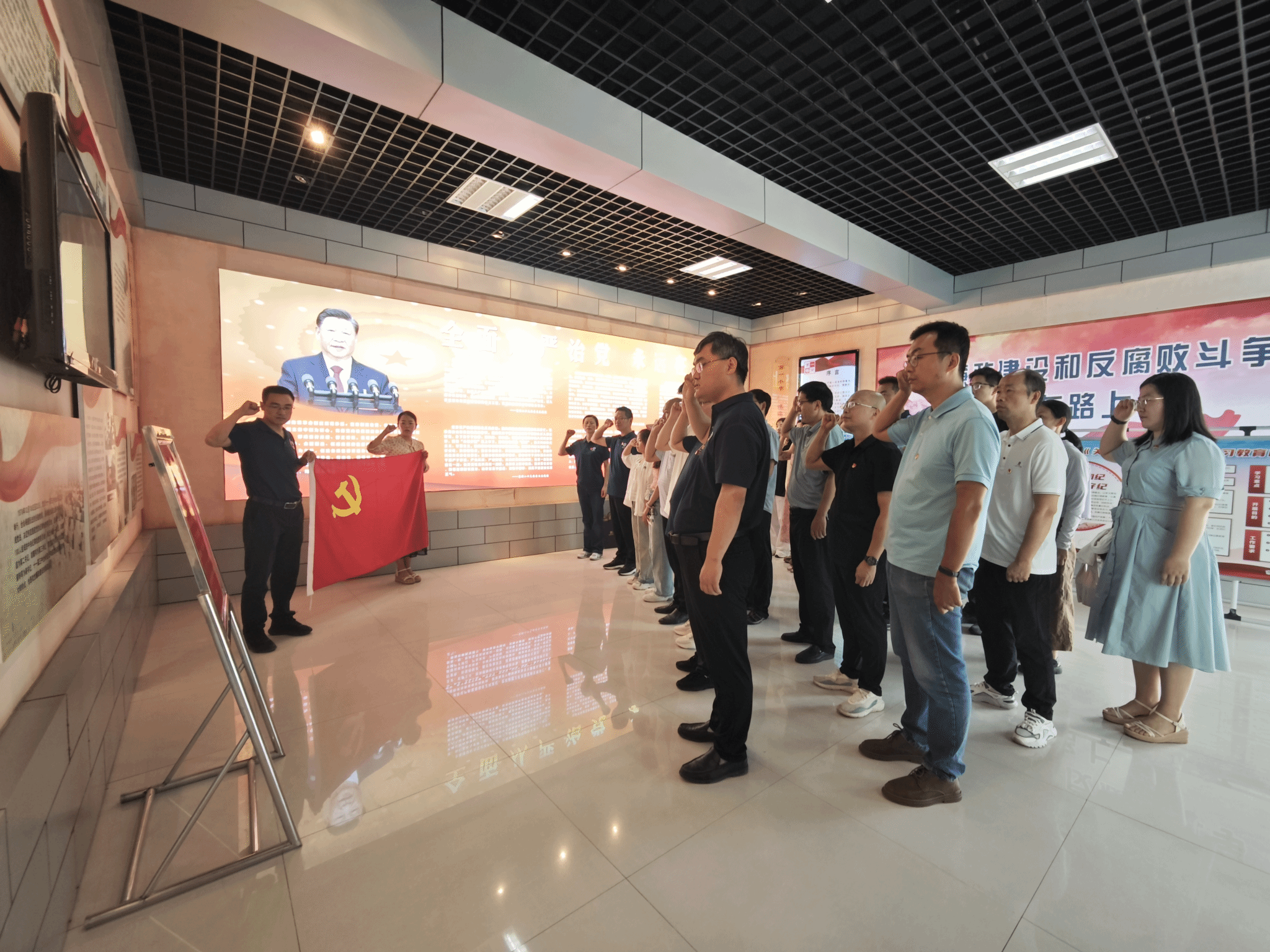参观结束后,全体党员重温入党誓词,接受党性洗礼,铿锵有力的誓言,宣示着坚定不移的理想信念。