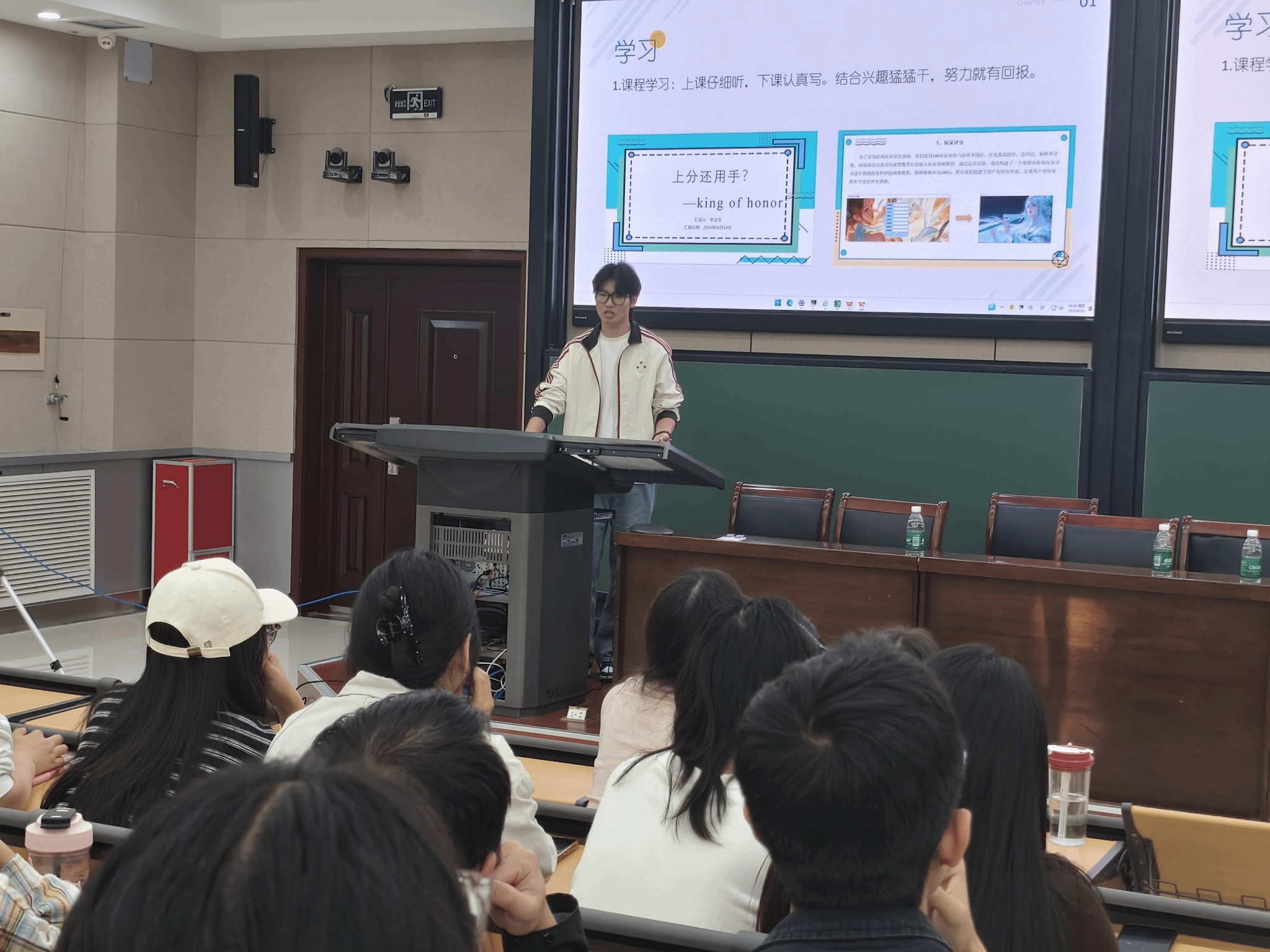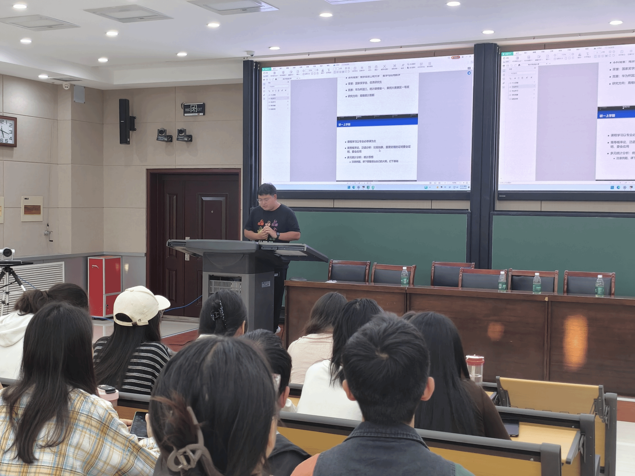 在经验分享环节,2023级研究生王睿思结合在字节跳动产品运营岗位的实战经历,从简历撰写、投递渠道到面试准备,系统梳理了求职过程中的关键环节,为有意走向行业岗位的同学指明了方向;王紫薇从学术研究角度出发,分享了文献检索的实用网站与技巧,提醒新生在专注科研的同时,也要学会平衡学业与生活。2023级刘玉婷和2024级杨露翔、金子璇结合自身参赛经历,详细介绍了“华为杯”“大湾区杯”“数维杯”等多项学科竞赛的备赛要点与参赛心得,推荐优质学习资源与学术软件,助力新生拓宽视野、夯实基础。申言忠同学则从“术”与“道”两个维度展开分享,通过具体案例阐释学习方法与心态调整的重要性,引导新生在提升专业能力的同时,注重内在修养与综合素养的锤炼。高琳同学以代数学为例,深入浅出地分享了专业课学习的方法与论文撰写的入门技巧,帮助新生构建起科研认知框架。