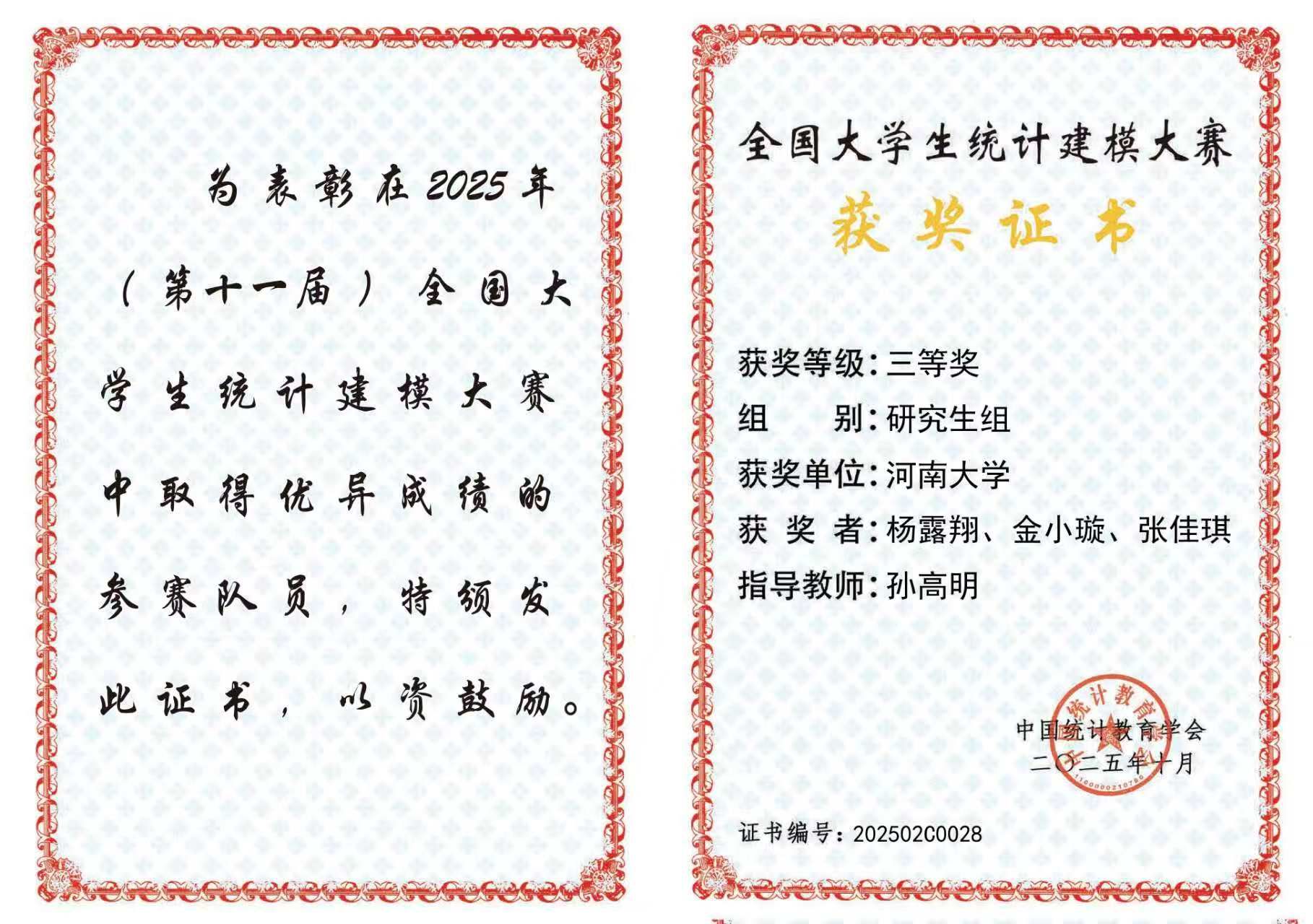 10月26日,第十一届全国大学生统计建模大赛国赛答辩赛在东北财经大学圆满落幕,我校数学与统计学院两支研究生团队凭借扎实的学术功底与创新应用能力,双双获奖。《助力“健康中国2030”战略——面向脑部疾病诊断的多模态脑影像智能融合研究》表现突出,在全国总决赛中荣获河南省唯一的国家二等奖;《红斑鳞状皮肤病智能辅助诊断——基于多模态数据与MedViT方法》荣获国家三等奖。
