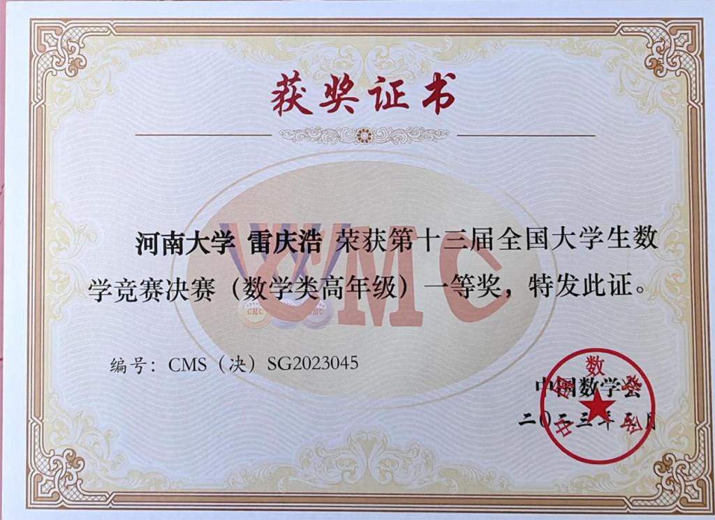 在本届竞赛中,数学与统计学院2018级数学与应用数学专业“明德计划”实验班(简称“实验班”)雷庆浩同学荣获数学专业高年级组一等奖,2020级实验班杜鑫宇同学荣获数学专业低年级组一等奖。目前,学院学子已累计获得专业组国家一等奖5项(我省学子累计获专业组国家一等奖8项)。2018级金融数学专业陈琦飞荣获数学专业组三等奖。欧亚学院2019级金融数学专业汤涵之荣获非数学专业组三等奖。