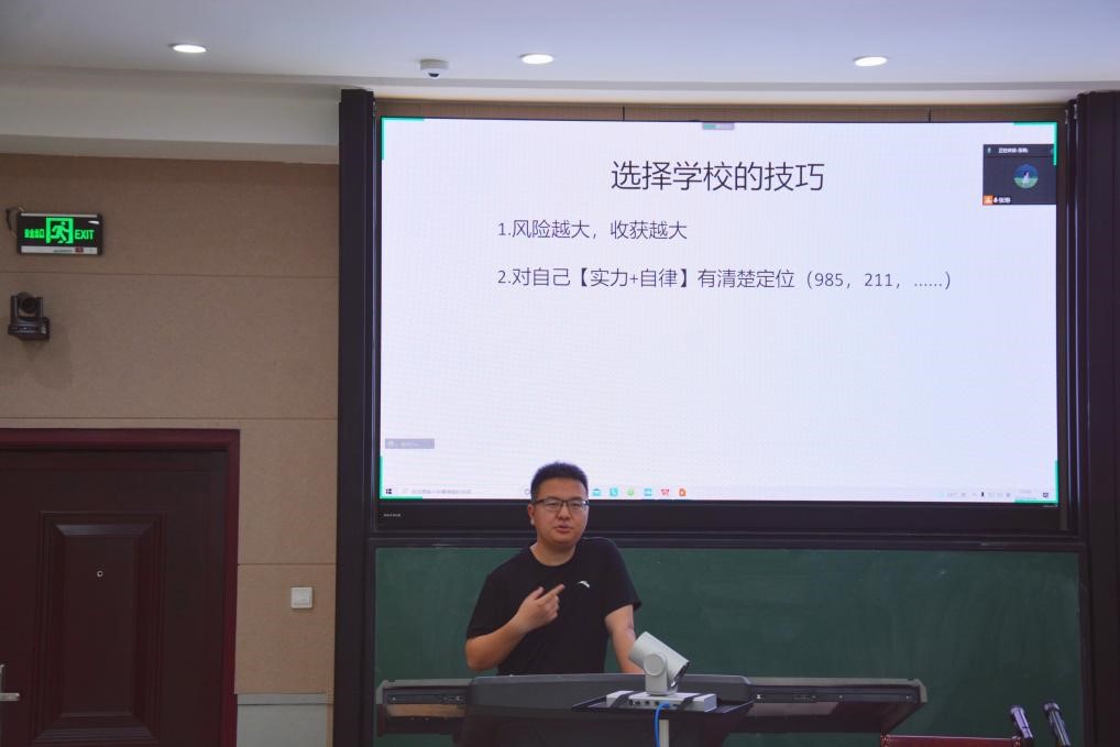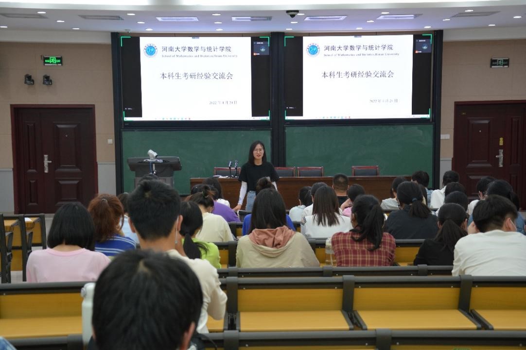 为帮助我院考研学子明确考研目标,鼓舞考研斗志,掌握学习方法与技巧,做好考研复习规划。4月24日下午,数学与统计学院在南阶教室举办了考研交流会。本次会议以线上线下相结合方式进行,共邀请了学院2018级8名优秀考研学长学姐分享经验和心得体会,2019级百余名本科生参加了本次交流会。会议由2019级辅导员贾丽冰主持。