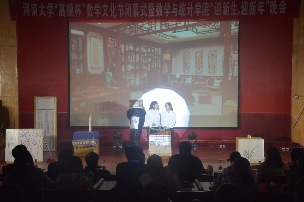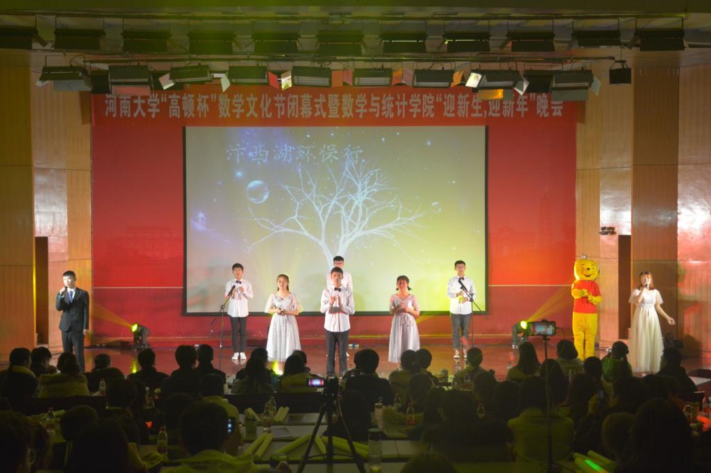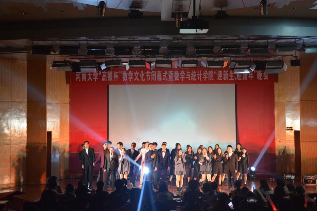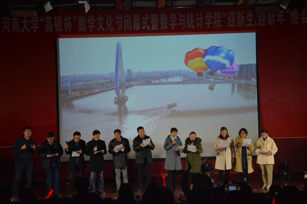 光阴荏苒,岁月匆匆。不知不觉间,数学与统计学院这个大家庭又多了许多可爱的新同学,我们也即将送走忙碌充实而又硕果累累的2019,迎来充满未知与挑战的2020。12月7日晚,我院于计算机二楼报告厅举办了以“‘新’然启航,数尽辉煌”为主题的“高顿杯”数学文化节闭幕式暨迎新生·迎新年晚会。河南大学特聘教授关庄丹、 学院党委书记史富强 、院长冯淑霞、党委副书记赵红磊、副院长杨一平、副院长解俊山、各年级辅导员及部分教师代表莅临晚会。