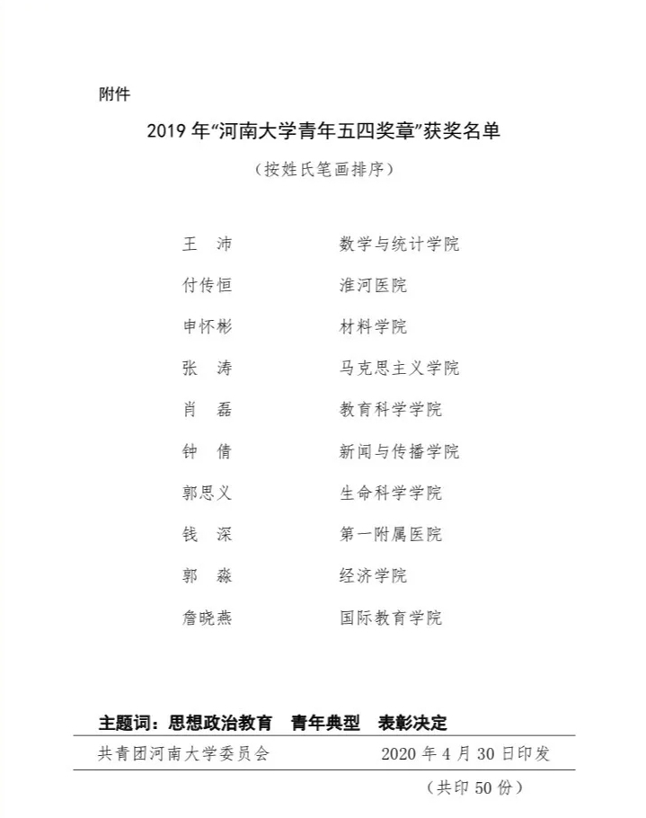 在此次表彰中,我院团委被评为“河南大学五四红旗团委”,王沛老师获得2019年“河南大学青年五四奖章”,安其丰老师被评为“河南大学青年岗位标兵”,路志业等30人获得“河南大学优秀共青团员”称号,吴璐瑶等12人获得“河南大学优秀共青团干部”称号,信息与计算科学2017级团支部、统计学专业2018级1班团支部、统计学专业2019级1班团支部共3个团支部被评为“河南大学五四红旗团支部”。