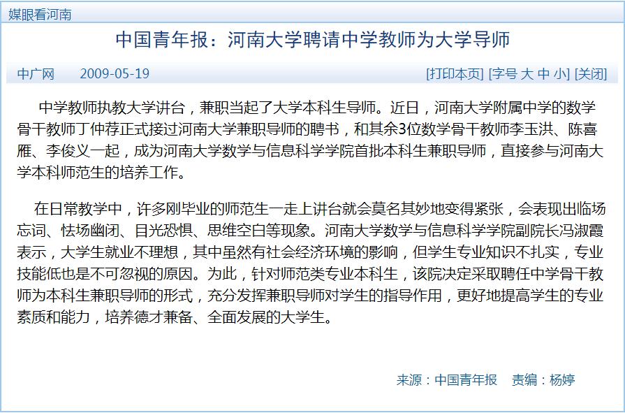 2009年5月19号,中国青年报以“中学名师登上大学讲台,值得鼓励”为题,报道了我院聘请河大附中丁仲荐、李俊义、陈喜雁、李玉洪为本科生兼职导师的事情。这应该是全国首例,随后各高校开展了“双导师制”活动。当年5月,中国教育报、新浪博客、中国新闻网、人民政协网、浙江在线、泉州网、学信网等新闻媒体转载了此消息,随后河南电视台到河大,采访了当时主管教学的副校长赵国祥、学院书记辛占香、我及两个学生,在河南电视台晚间新闻进行了报道。同年7月底,学院又召开了以“应该培养什么样的中学数学教师’为主题的座谈会,邀请了将近80位河南省知名中学数学骨干教师及校领导参加,上午由吴可院长、许以超先生、王世坤先生做主题报告,下午我主持座谈,聘请了部分参会者为我院本科生的兼职导师。